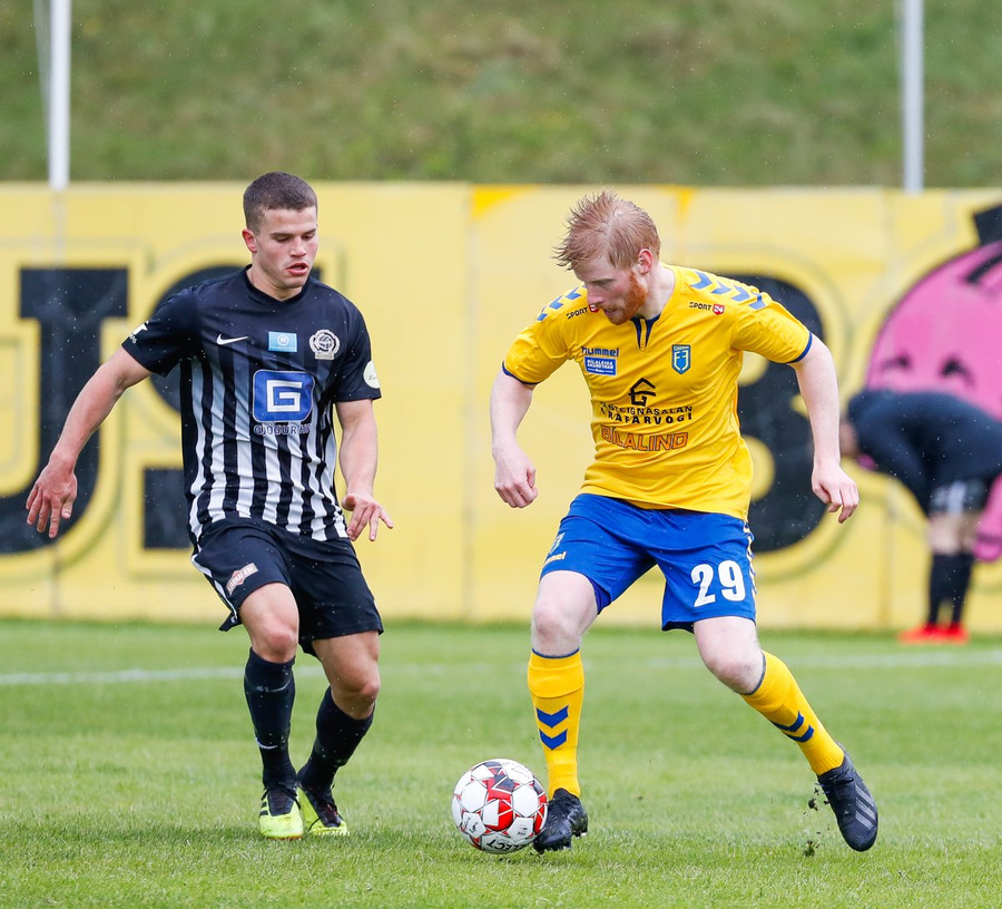 Gauti kemur alltof seint í tæklingu og fær verðskuldað gult!
