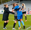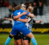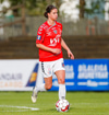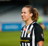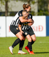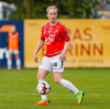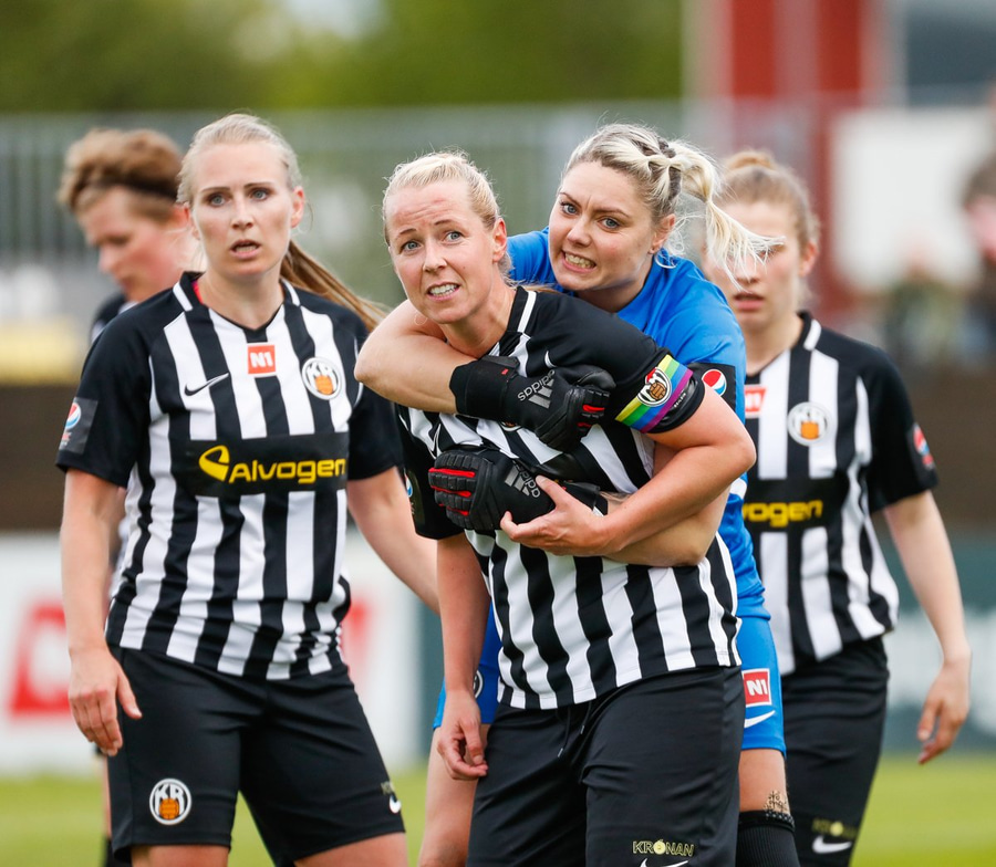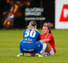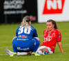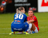 Emma liggur eftir. Virðist hafa misstigið sig þegar hún reynir að halda boltanum inn á vellinum. Vonum að þetta sé ekki alvarlegt.