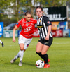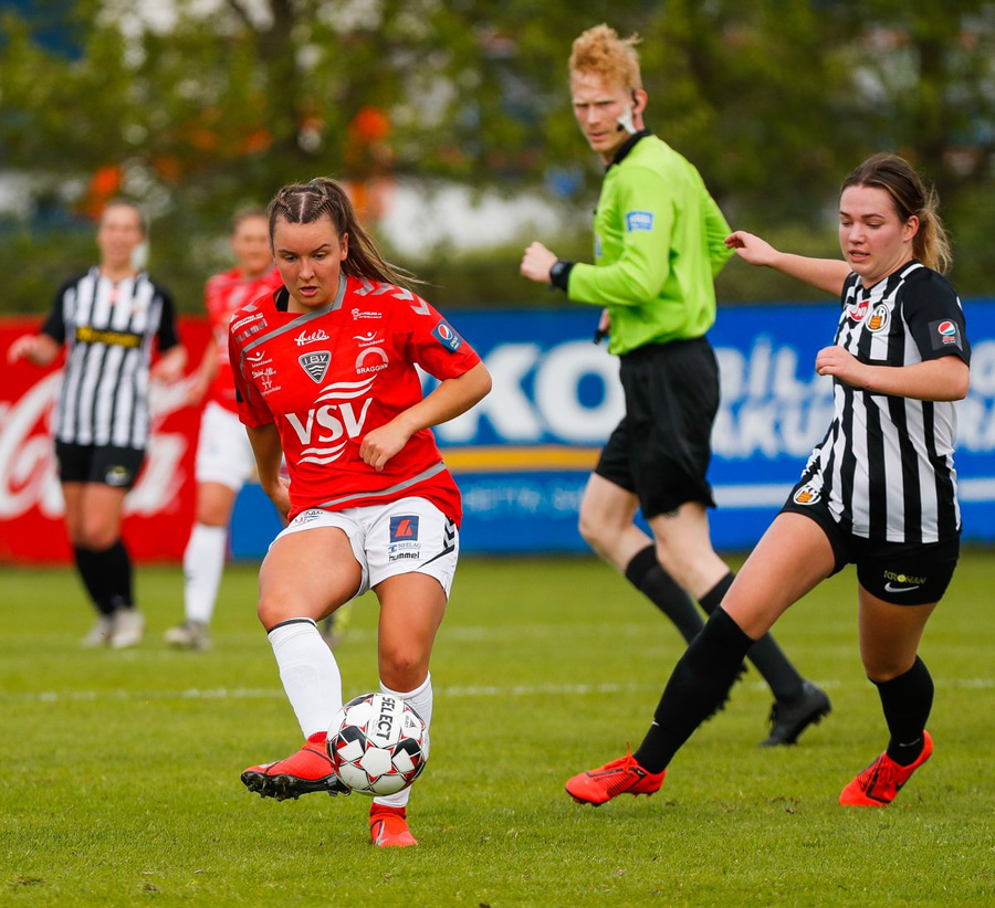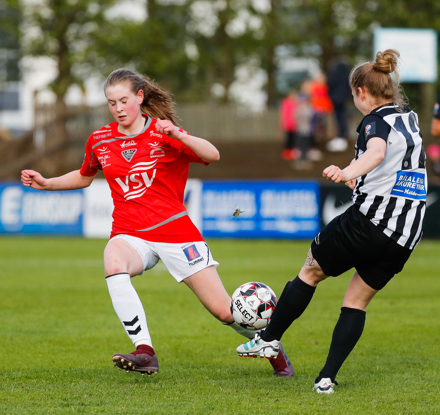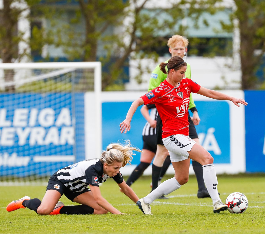 Tekur Kristínu Ernu niður á miðjum vallarhelmingi KR-inga.