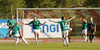 Áslaug tekur aukaspyrnuna sem er utarlega á vellinum en boltinn fer yfir allan pakkann.