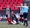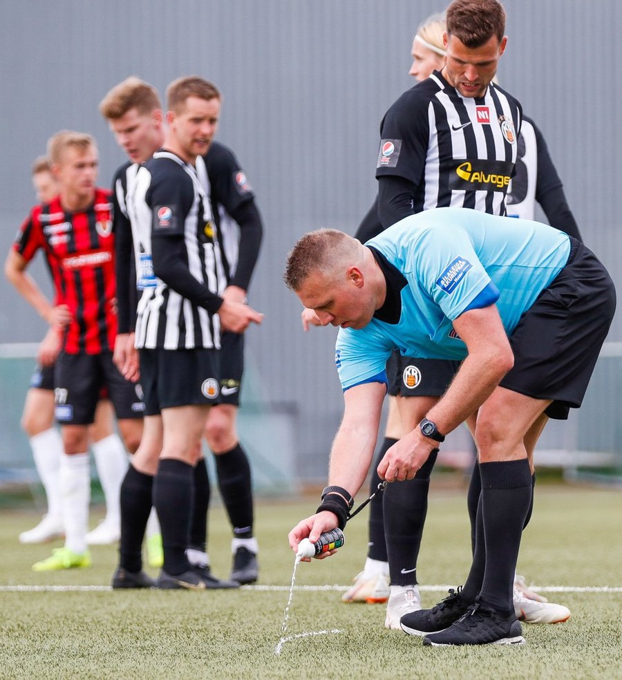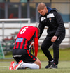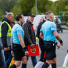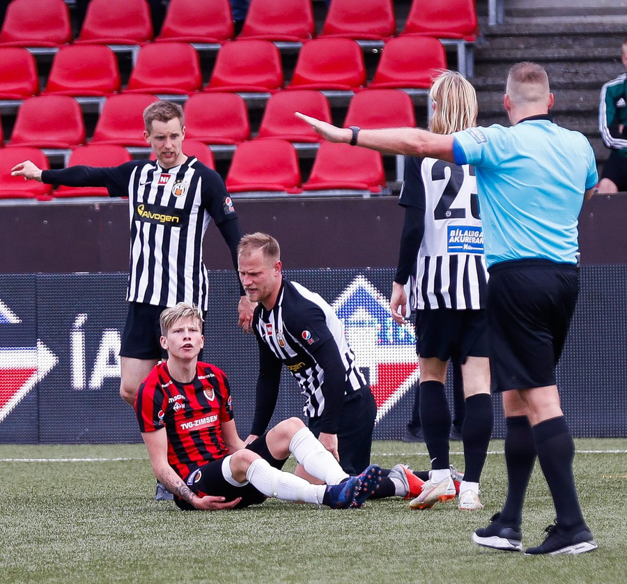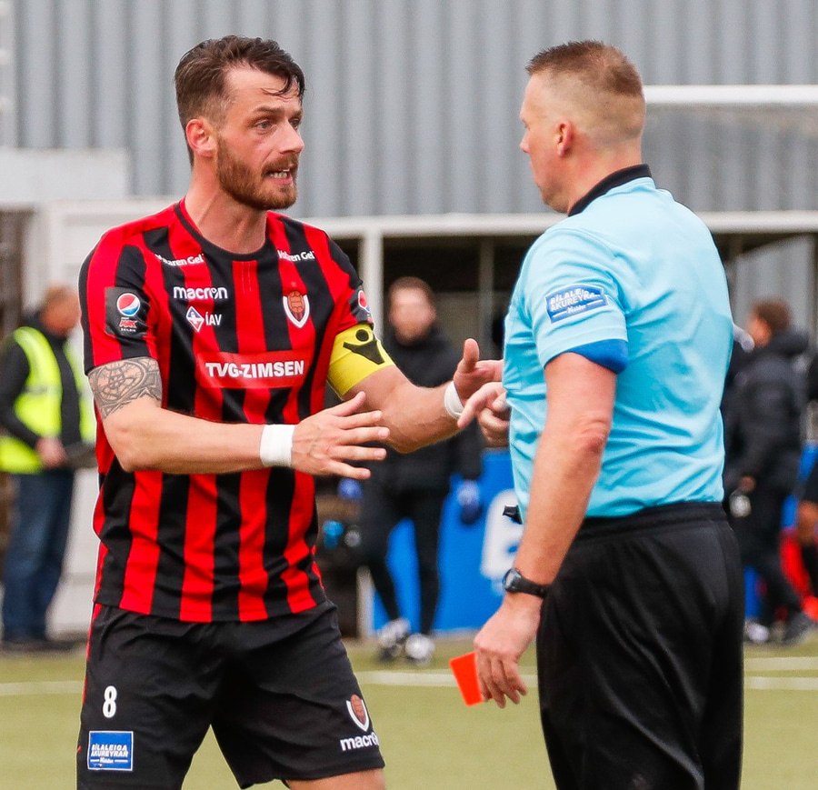 Sá ekki almennilega hvað gerðist en svo virðist sem að línuvörðurinn hafi séð það. Ætli það hafi ekki verið olnbogaskot. Mjög vont fyrir Víkinga.