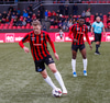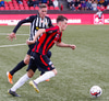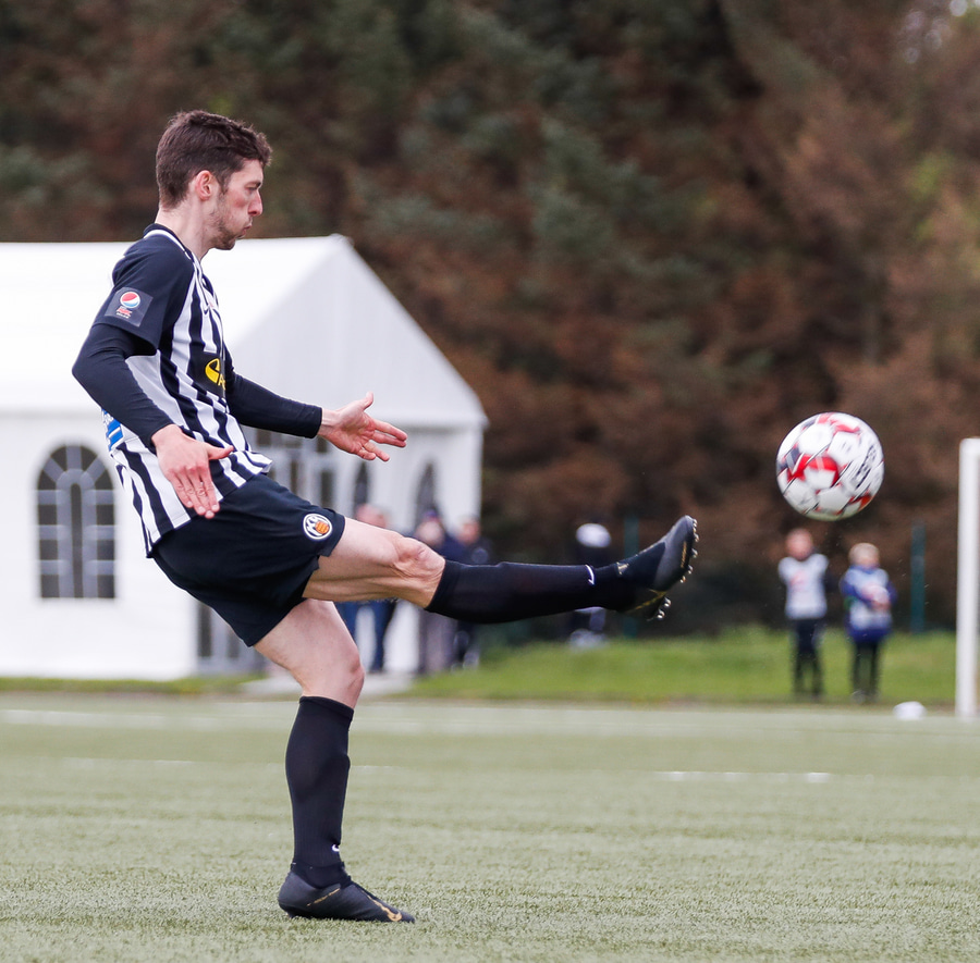 Kennie Chophart reynir hér að taka hann á lofti með vinstri en skotið er langt framhjá.