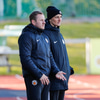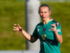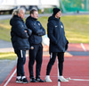 Vallarvörður að vökva völlinn, en gerði ekki alveg ráð fyrir að vindurinn myndi bera vatnið alla leið á heiðursvörðinn sem bíður þess liðin komi inn á völlinn. Litlu standa eins og hetjur og halda línunni óaðfinnalega þrátt fyrir þessar óvæntu skúrir.
