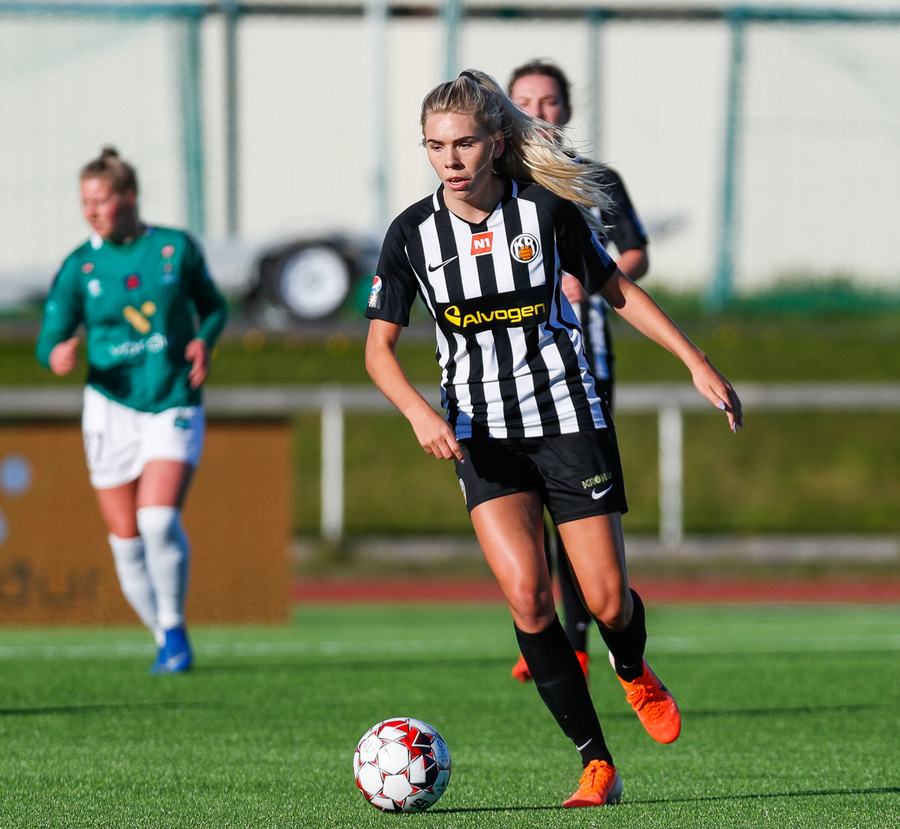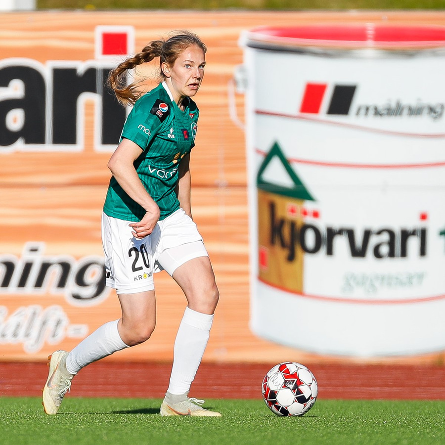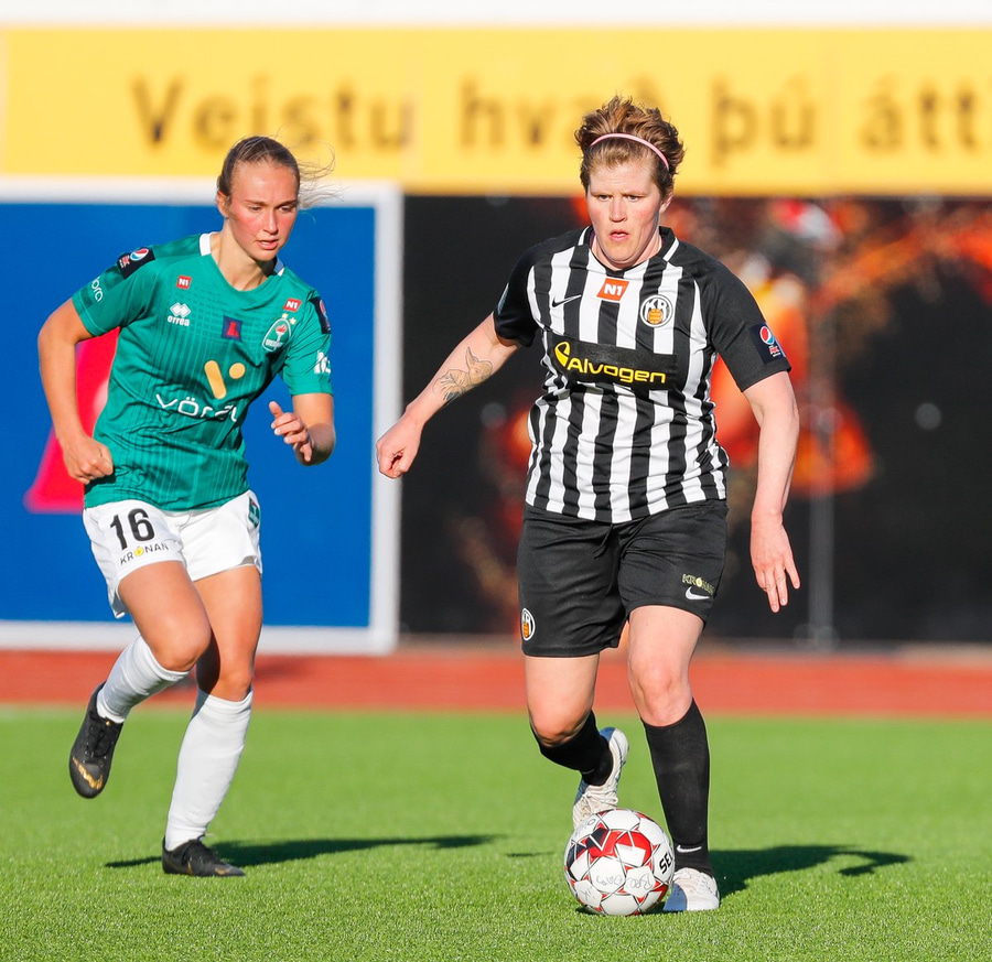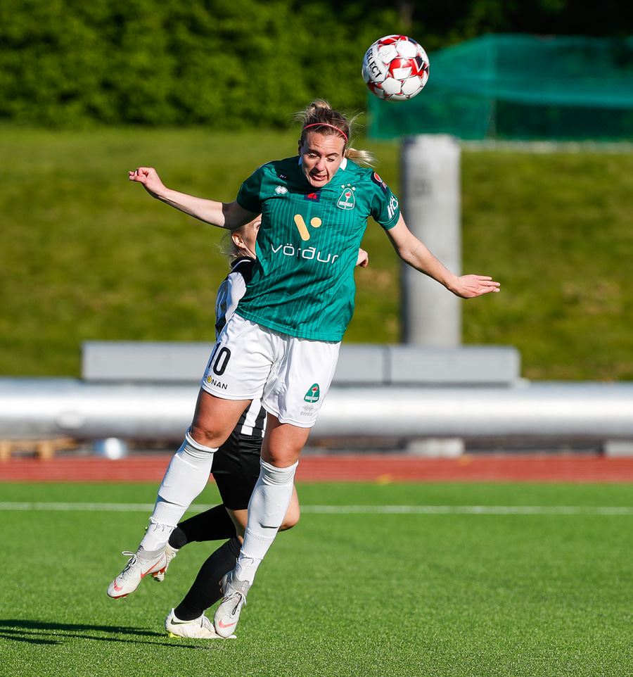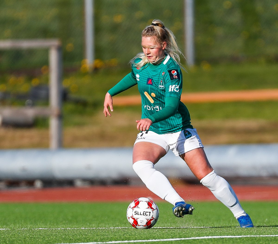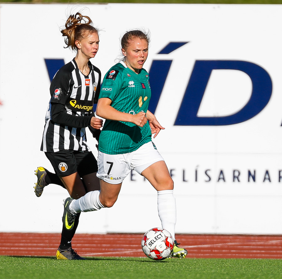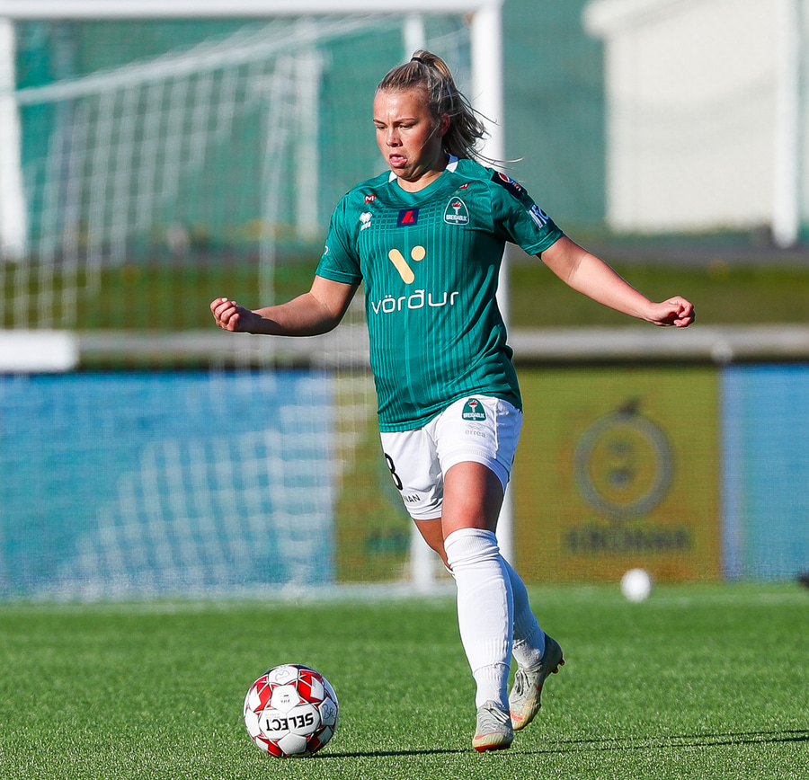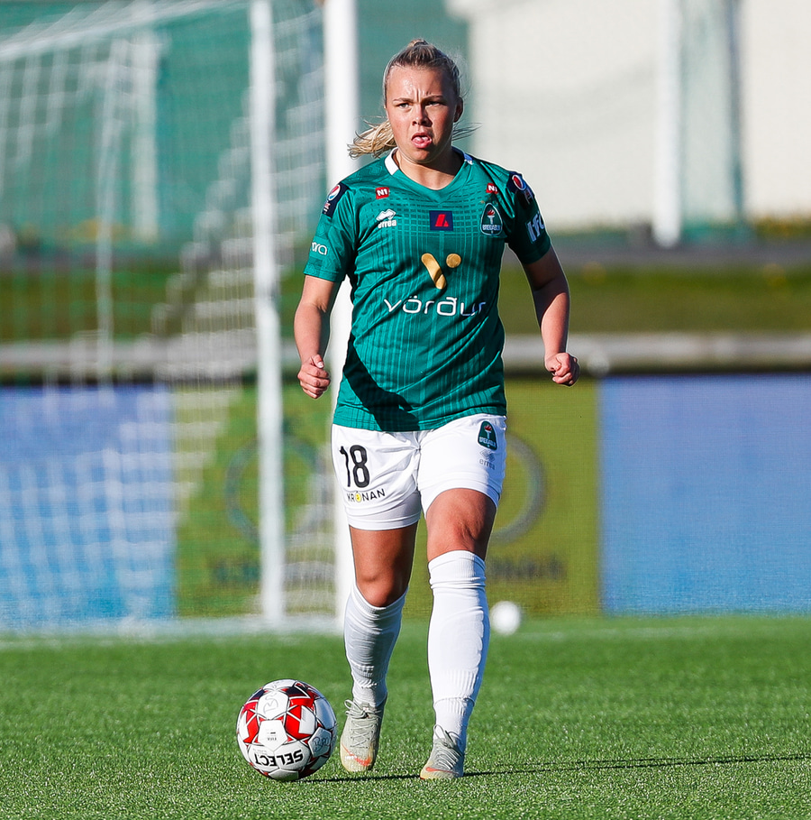 Guðmunda Brynja vinnur boltann á hægri kantinum og reynir að finna samherja með löngum bolta inn í teig en það gengur ekki.