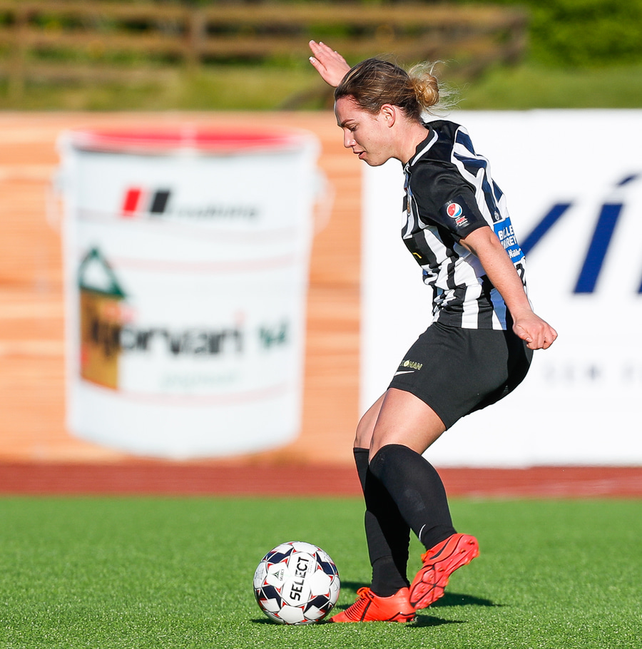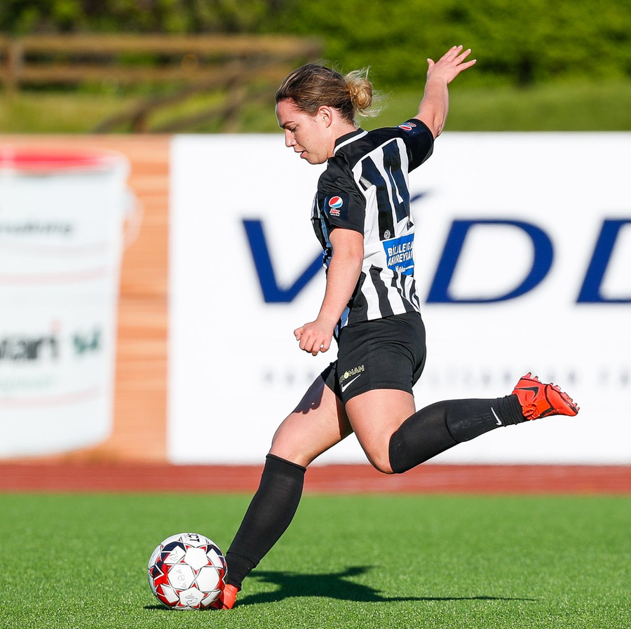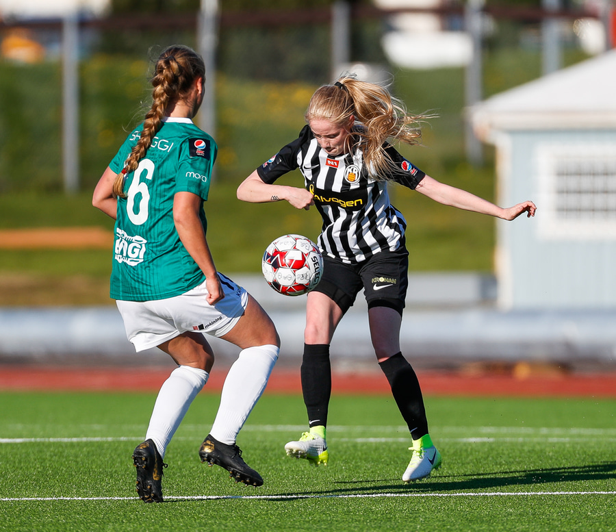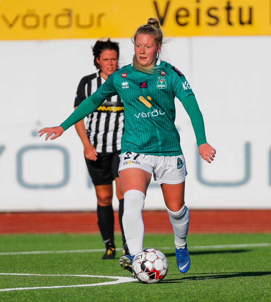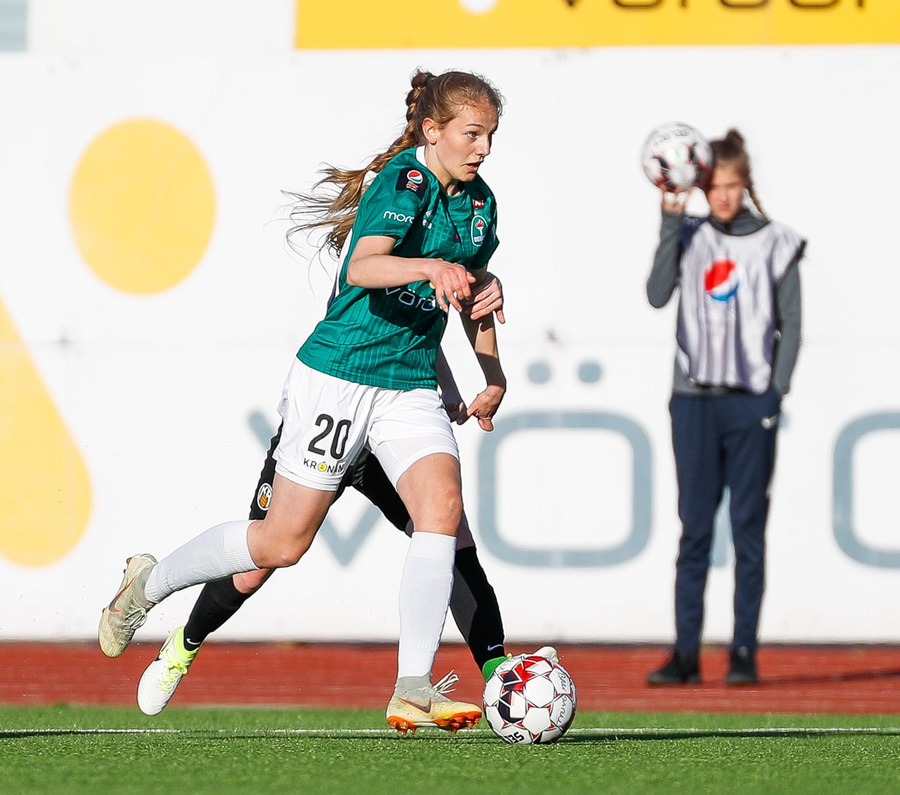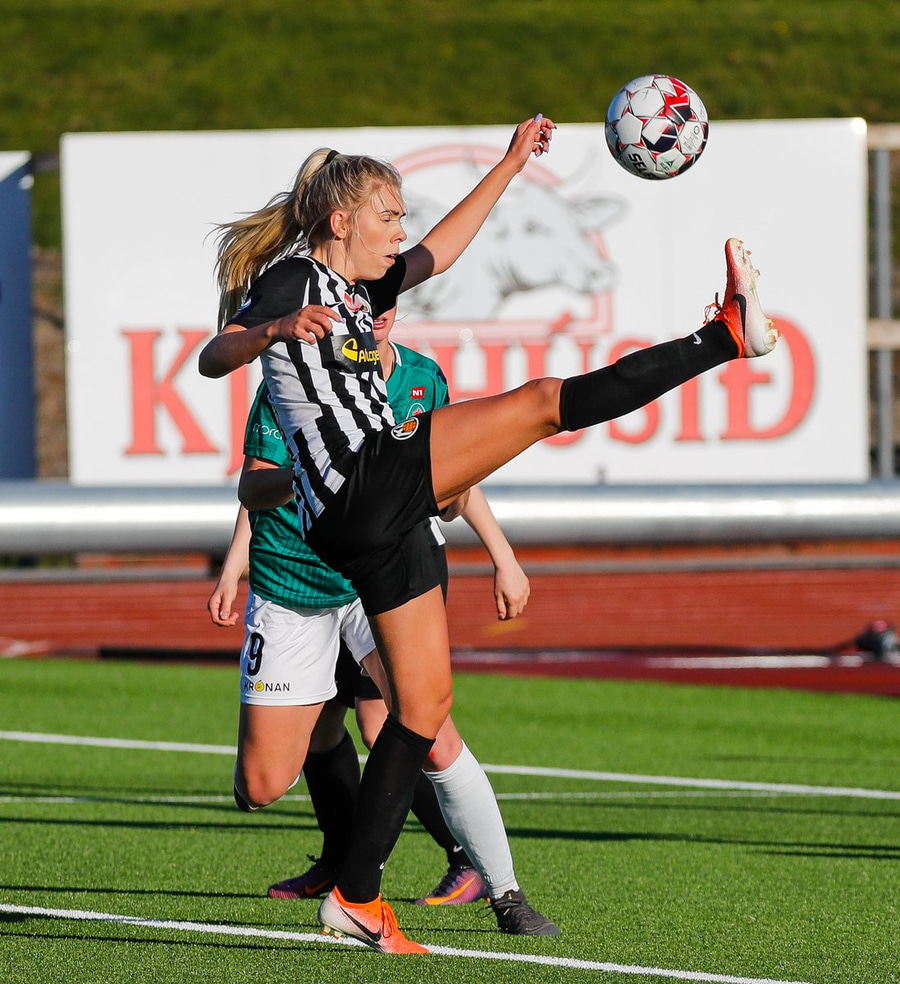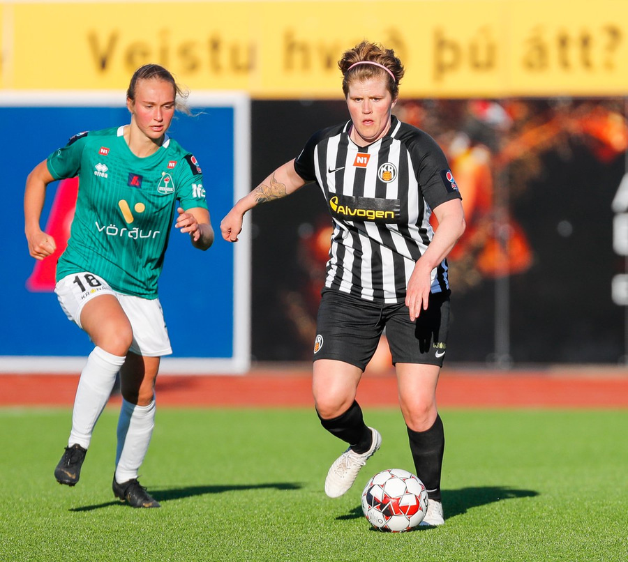 Guðmunda Brynja vinnur boltann á hægri kantinum og reynir að finna samherja með löngum bolta inn í teig en það gengur ekki.
