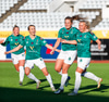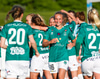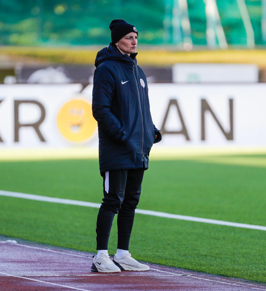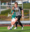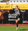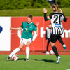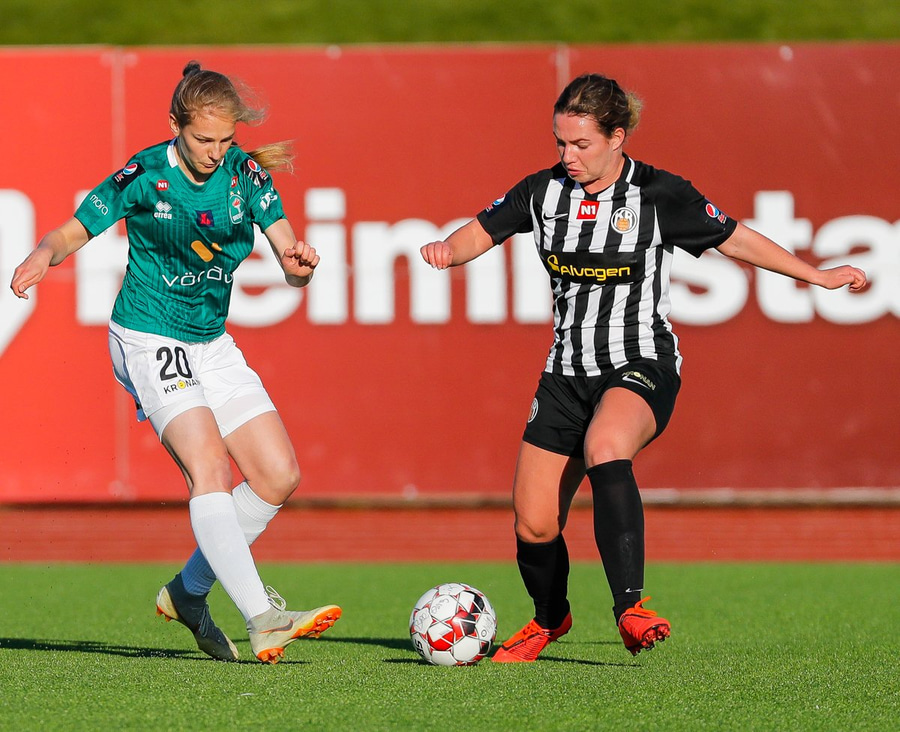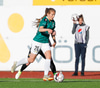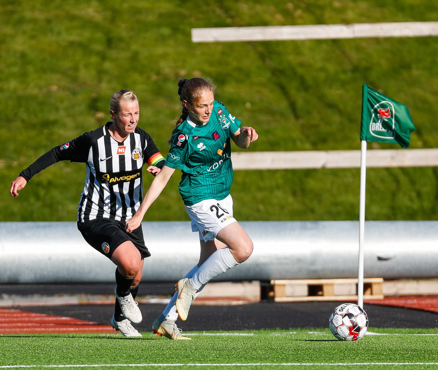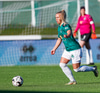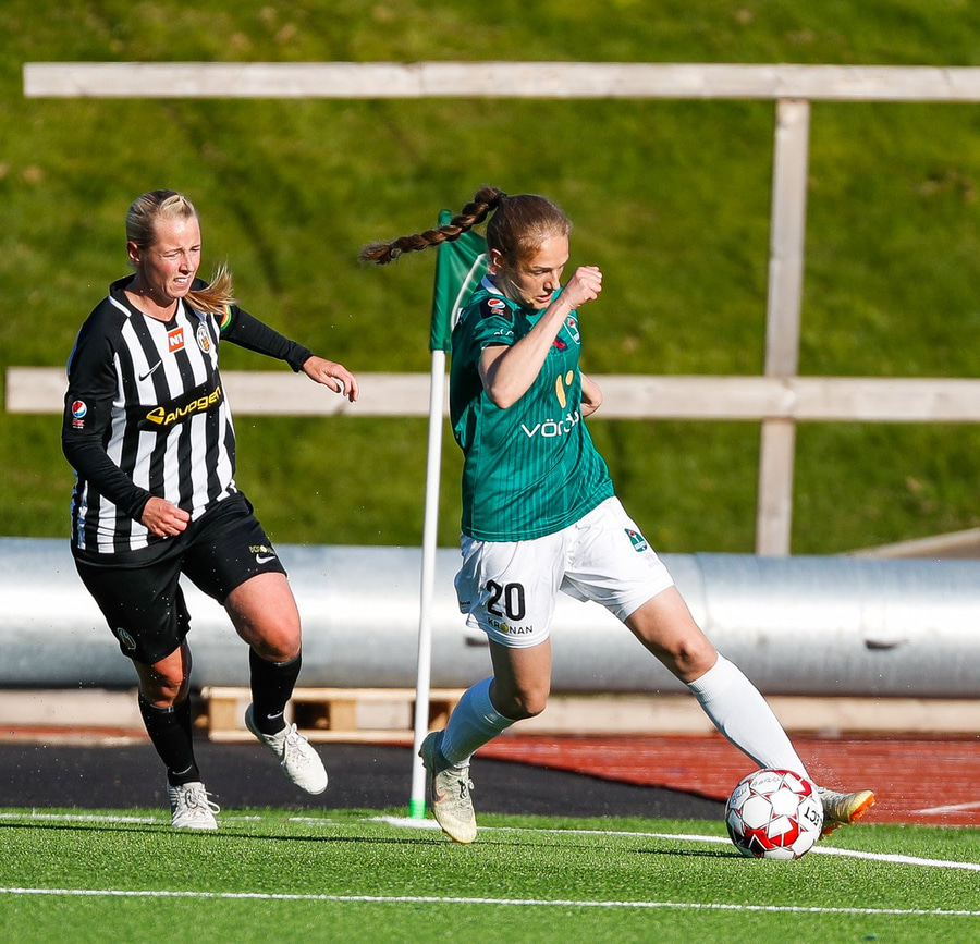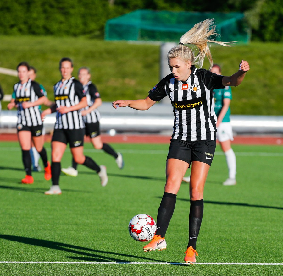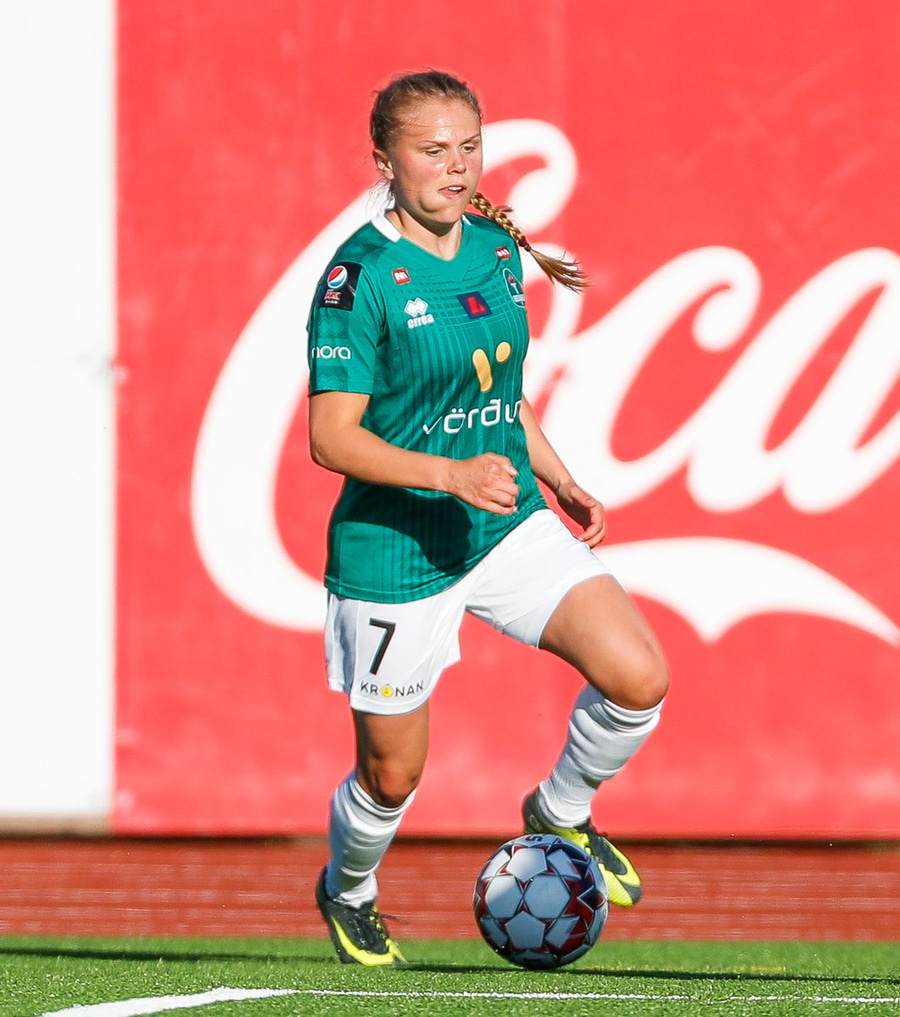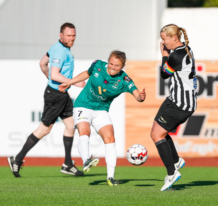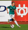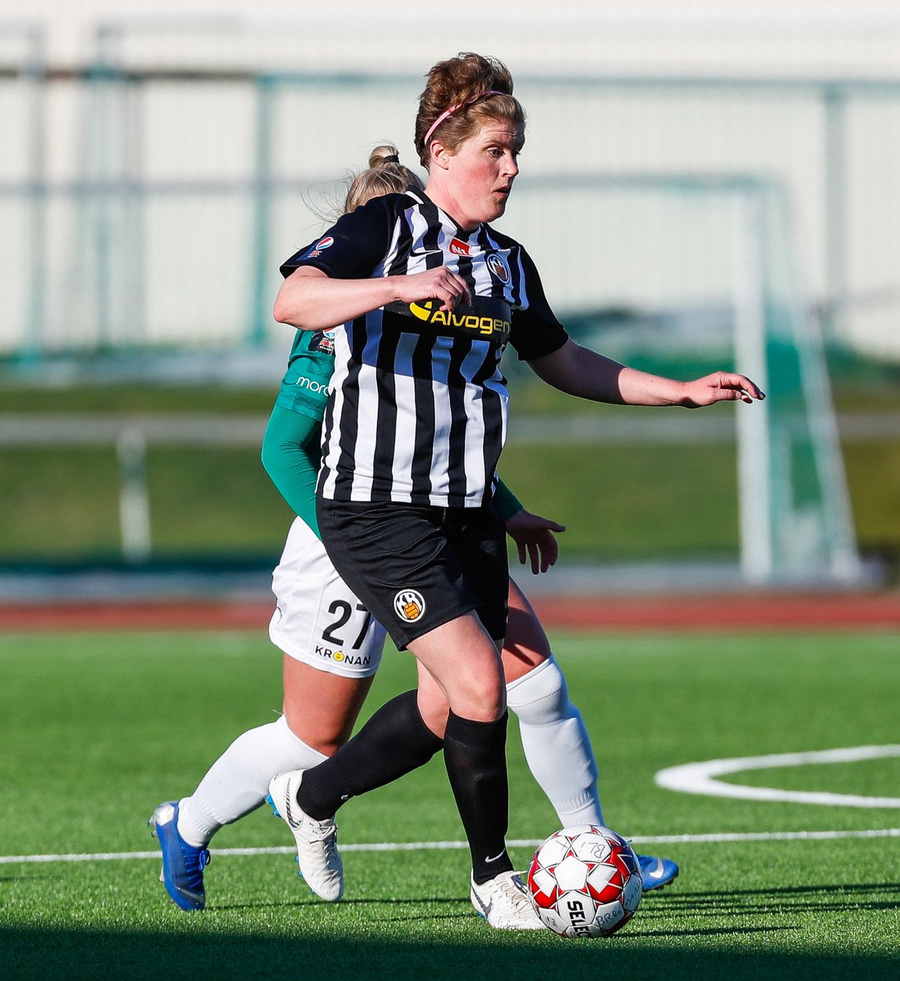 Guðmunda Brynja vinnur boltann á hægri kantinum og reynir að finna samherja með löngum bolta inn í teig en það gengur ekki.