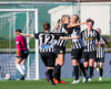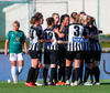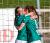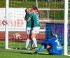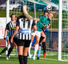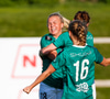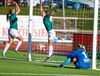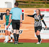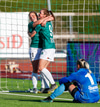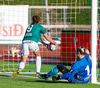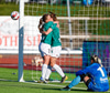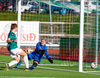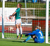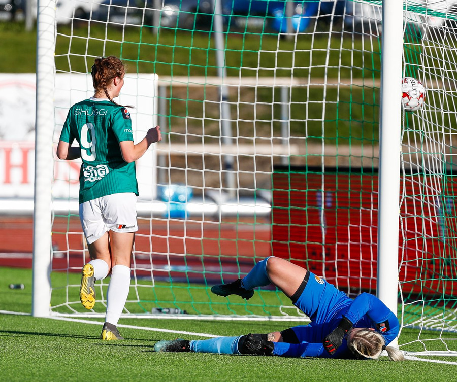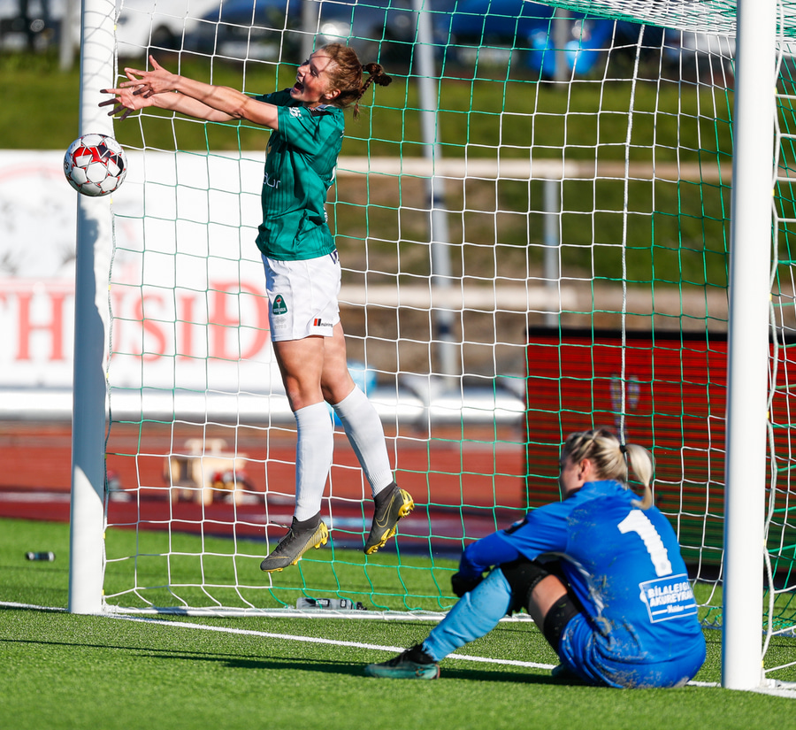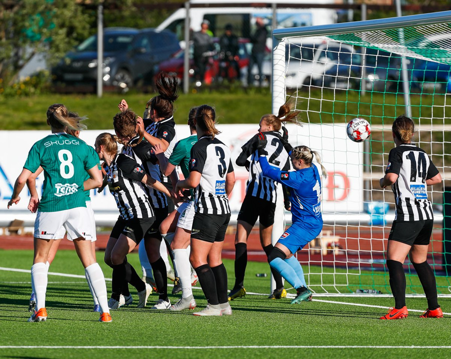 Vá Sonný heppinn. Katrín Ómars sendir lúmska sendingu inn í teiginn, Sonný telur sig til að taka á móti boltanum en Guðmunda kemur úr hinni áttinni og nær tá í boltann áður en markmaðurinn kemst í hann, snertingin ber boltann framhjá.
