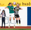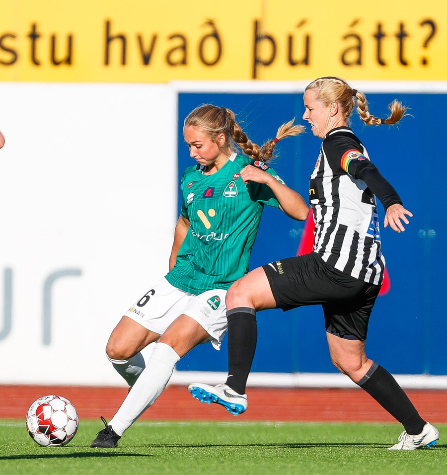 Guðmunda Brynja er við það að komar upp að endalínu Blika en Áslaug Arna gerir rétt nóg til að stoppa fyrirgjöf án þess að brjóta.