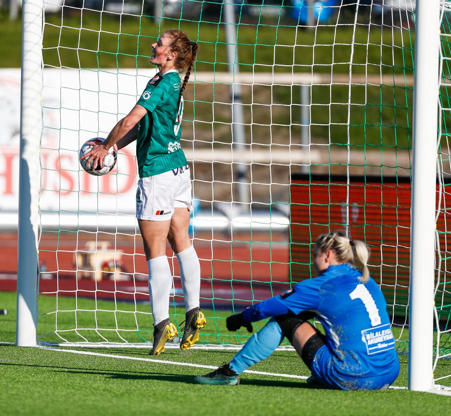Ætla að játa að ég var með nefið í tölvuna að skrá það inn að Hlíf væri að koma inn á! En það var sending inn í teiginn sem Sonný er að reyna ná en Ingunn potar tánni í boltan og til Hlífar, sem minnkar muninn eftir tuttugu sekúndna leik!