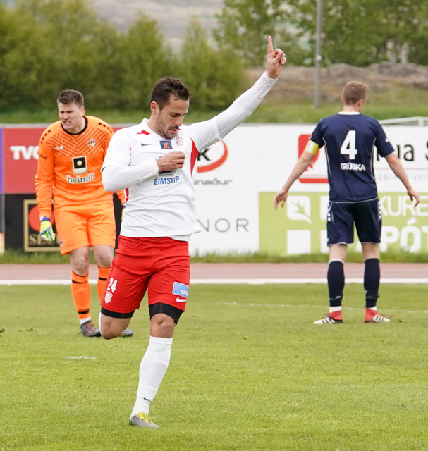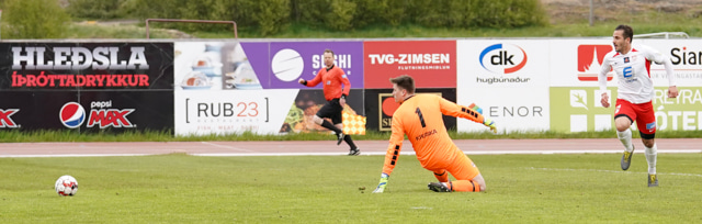 Fær boltann rétt fyrir utan teig og lætur vaða. Arnar Darri réð ekki við skotið sem endaði niðri í vinstra horninu.