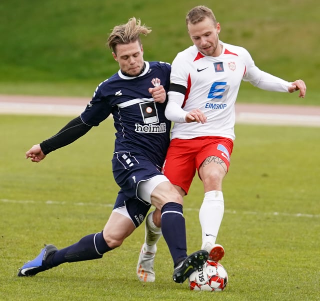 Arnar Darri tæpur þegar hann setur boltann niður. Alvaro var fyrir aftan hann!