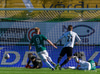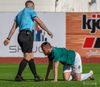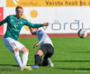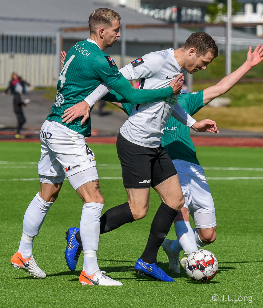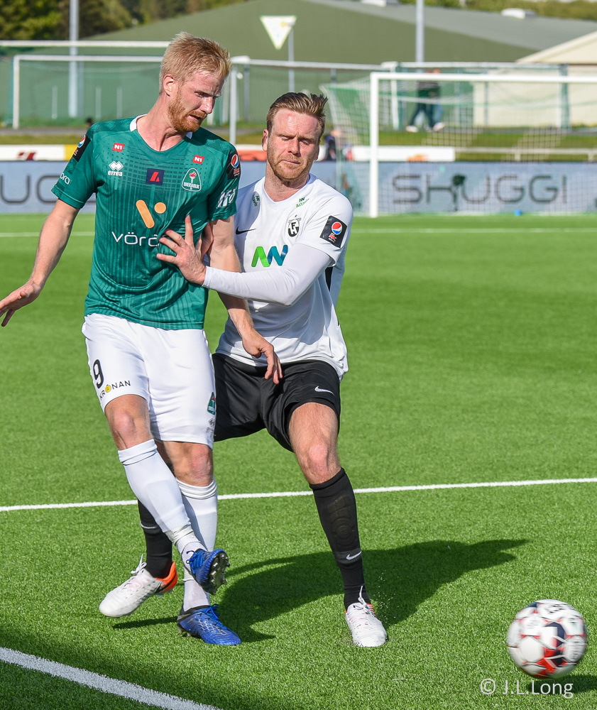 Höskuldur hér með skemmtilega sendingu ætlaða Thomasi en Vignir er fljótur útúr markinu og handsamar knöttinn.