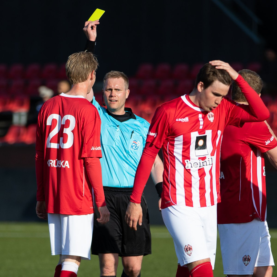 Fær gult fyrir tæklingu í teignum og Leiknir fær víti í kjölfarið.