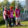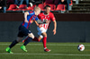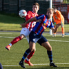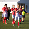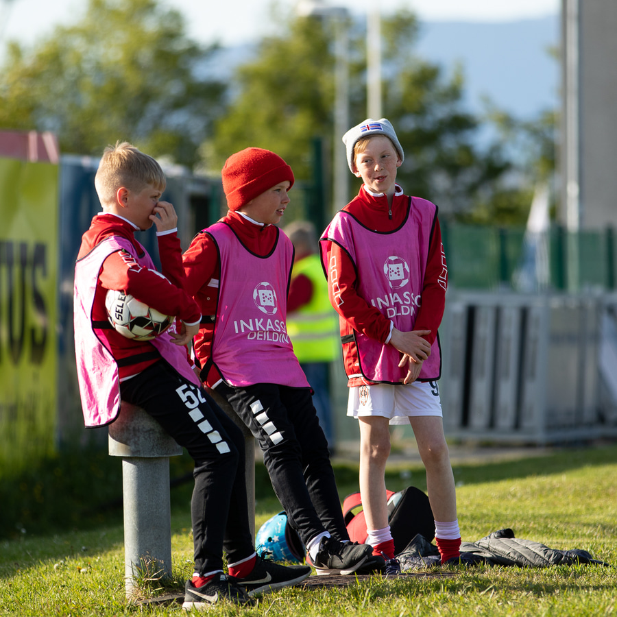 Liðin ganga inn á völlinn í sínum einkennislitum. Þróttur í rauðu og hvítu og Leiknir í bláu og dökk rauðu.