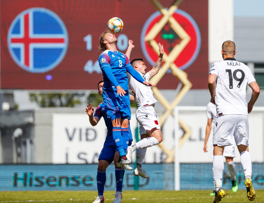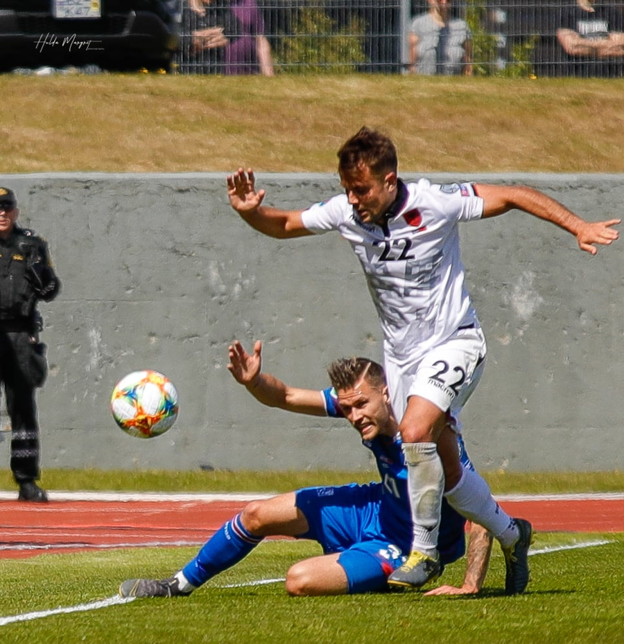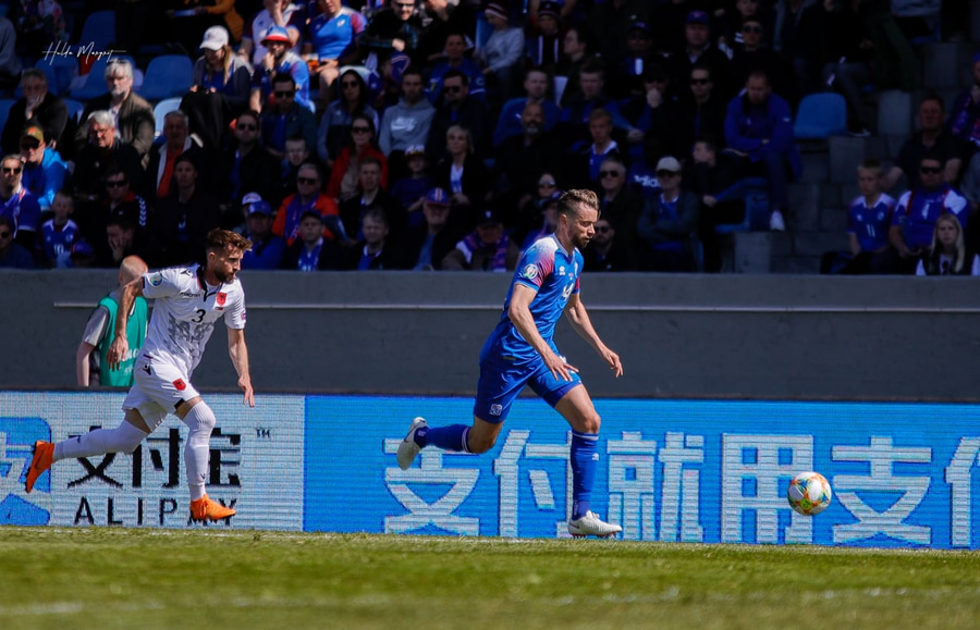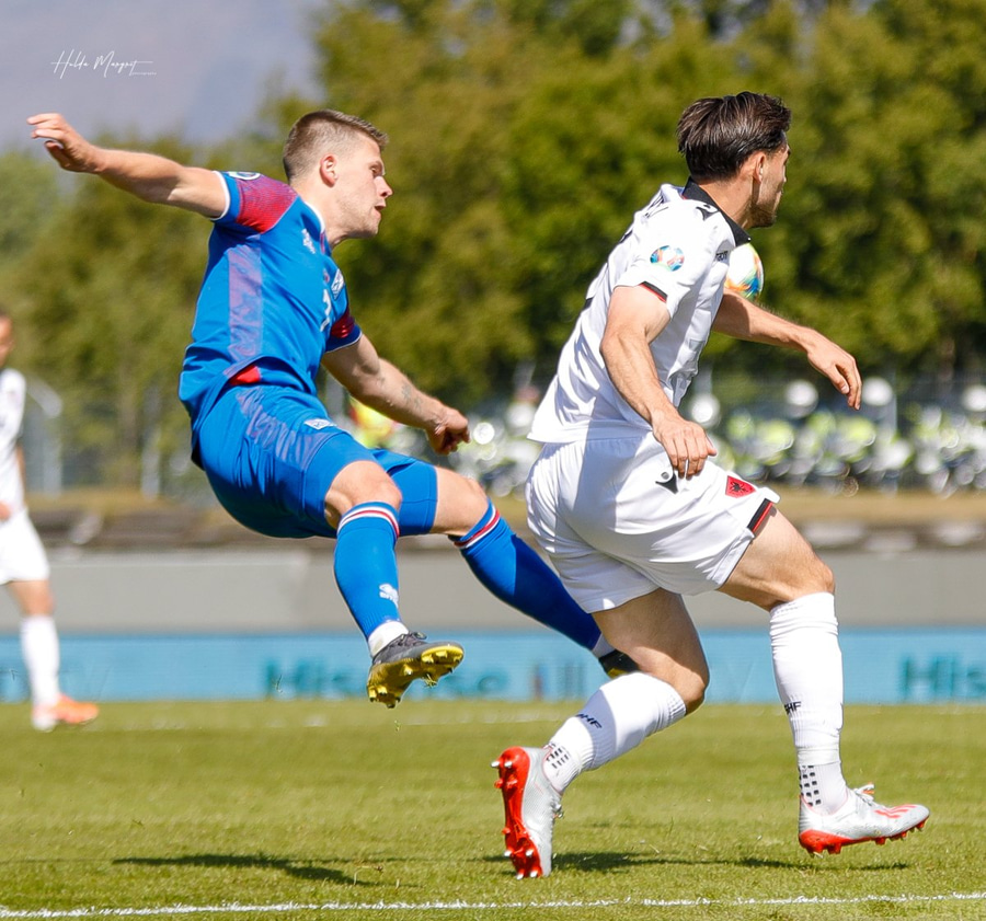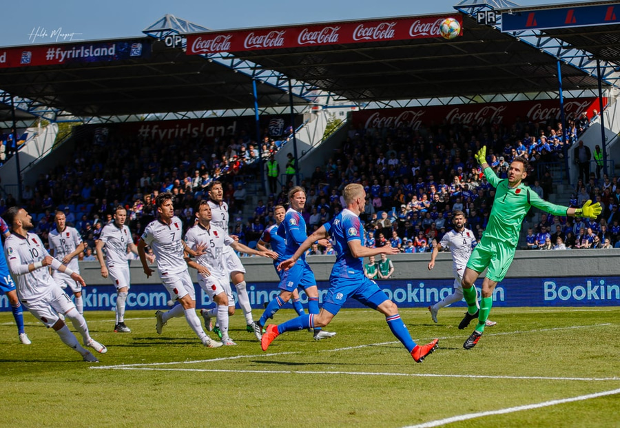 Jóhann Berg ætlar að hreinsa burtu hornið hjólhestaspyrnu og vill það ekki betur en svo að boltinn berst beint á Albana í teignum sem betur fer komast varnarmenn Íslands fyrir boltann.