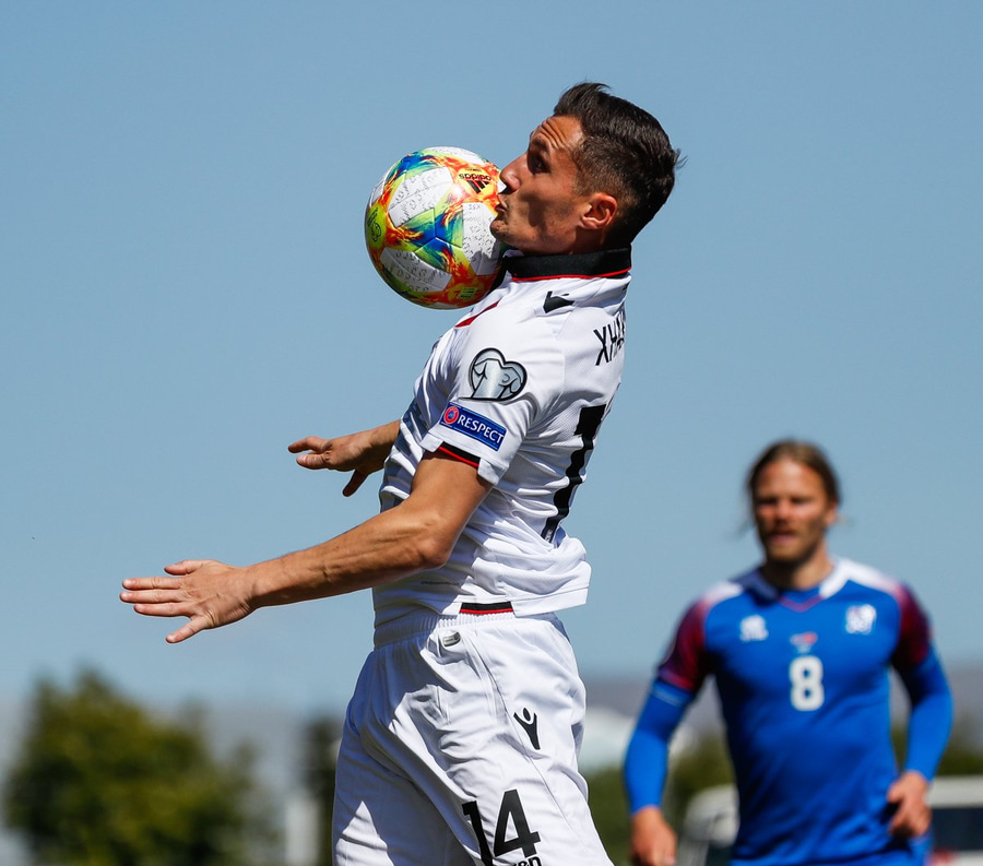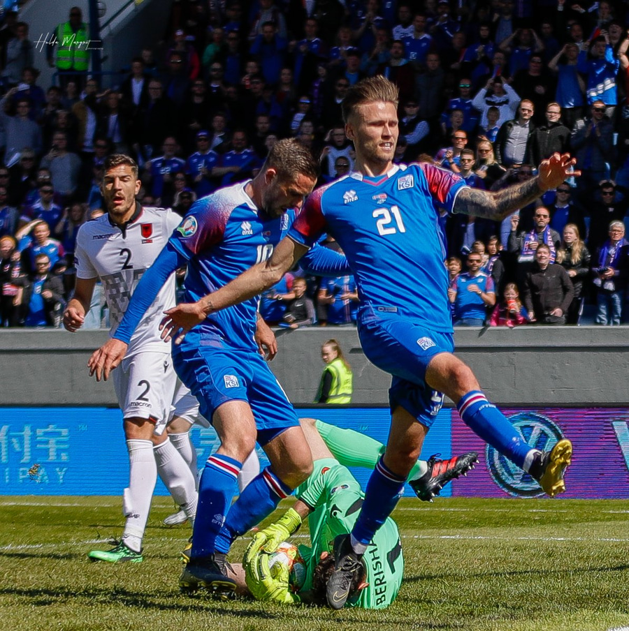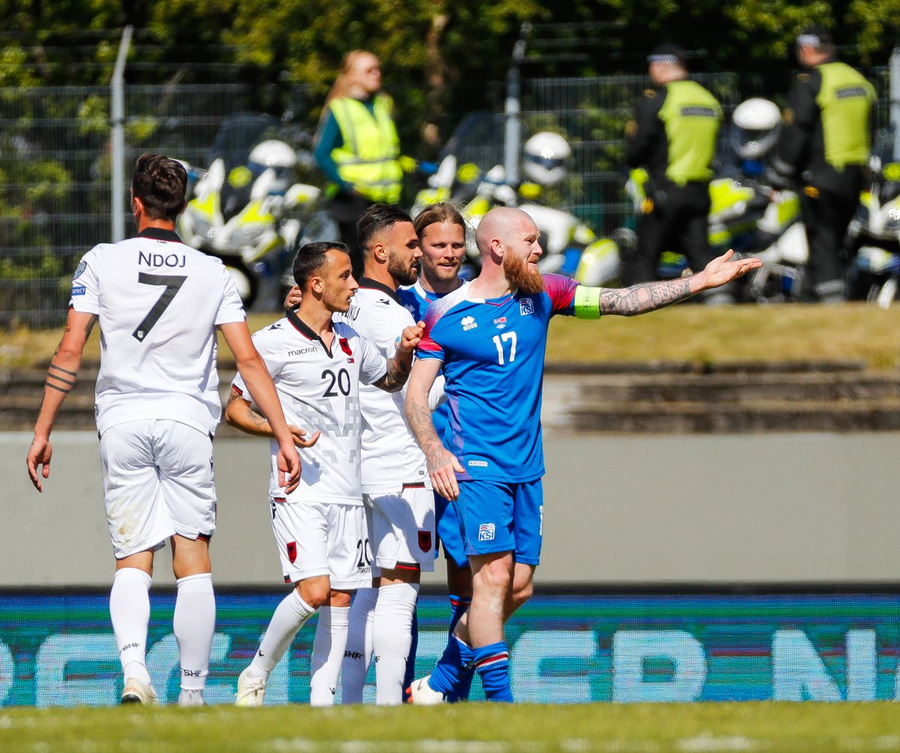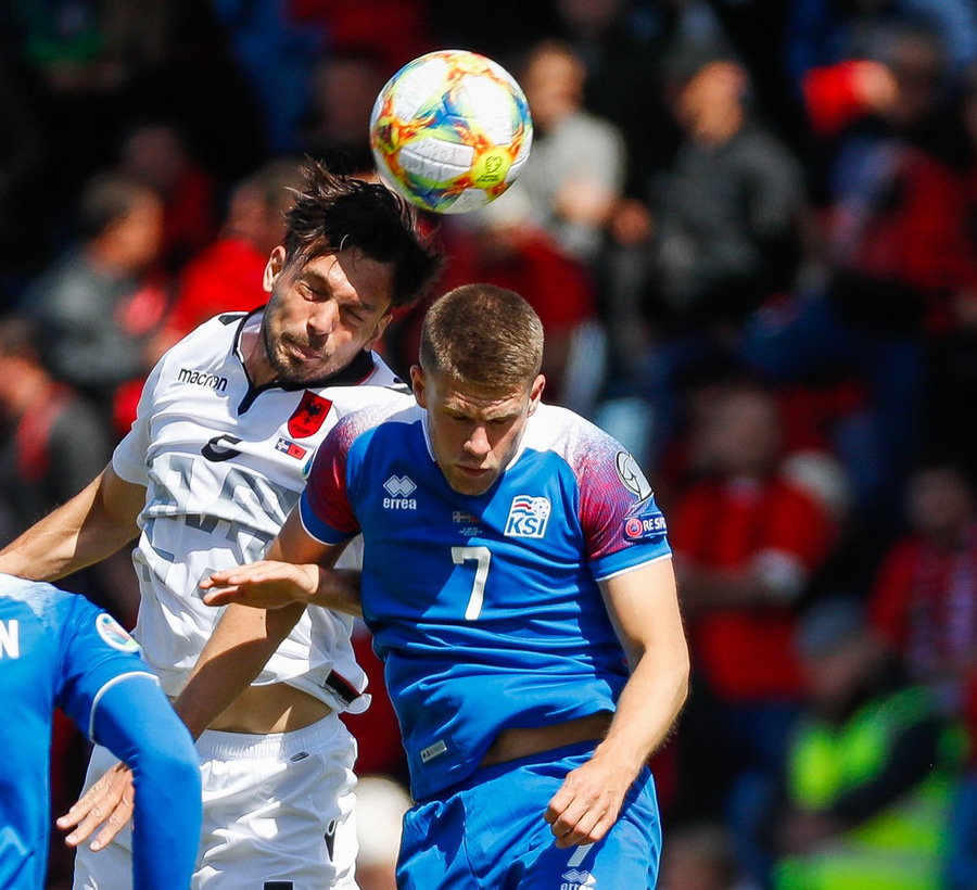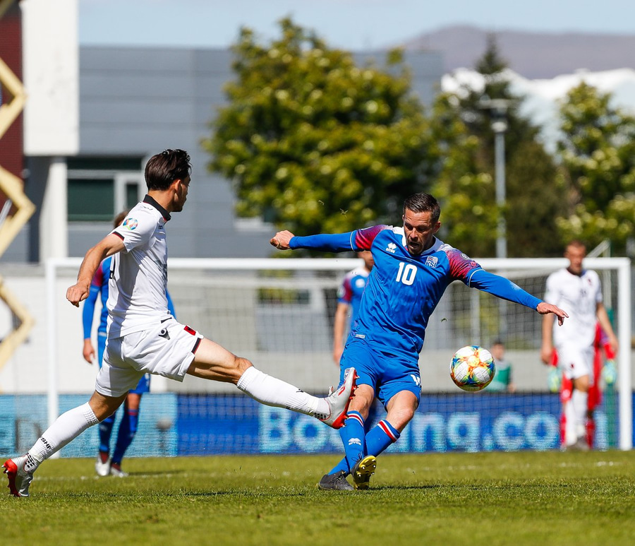 Jóhann Berg ætlar að hreinsa burtu hornið hjólhestaspyrnu og vill það ekki betur en svo að boltinn berst beint á Albana í teignum sem betur fer komast varnarmenn Íslands fyrir boltann.