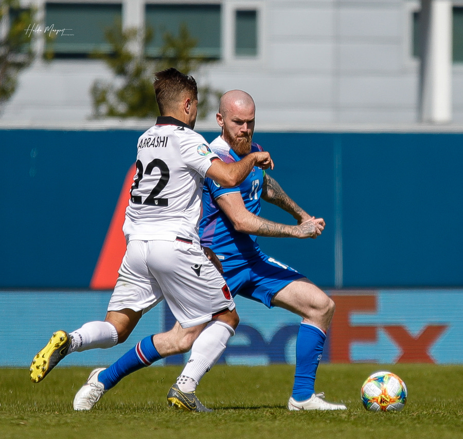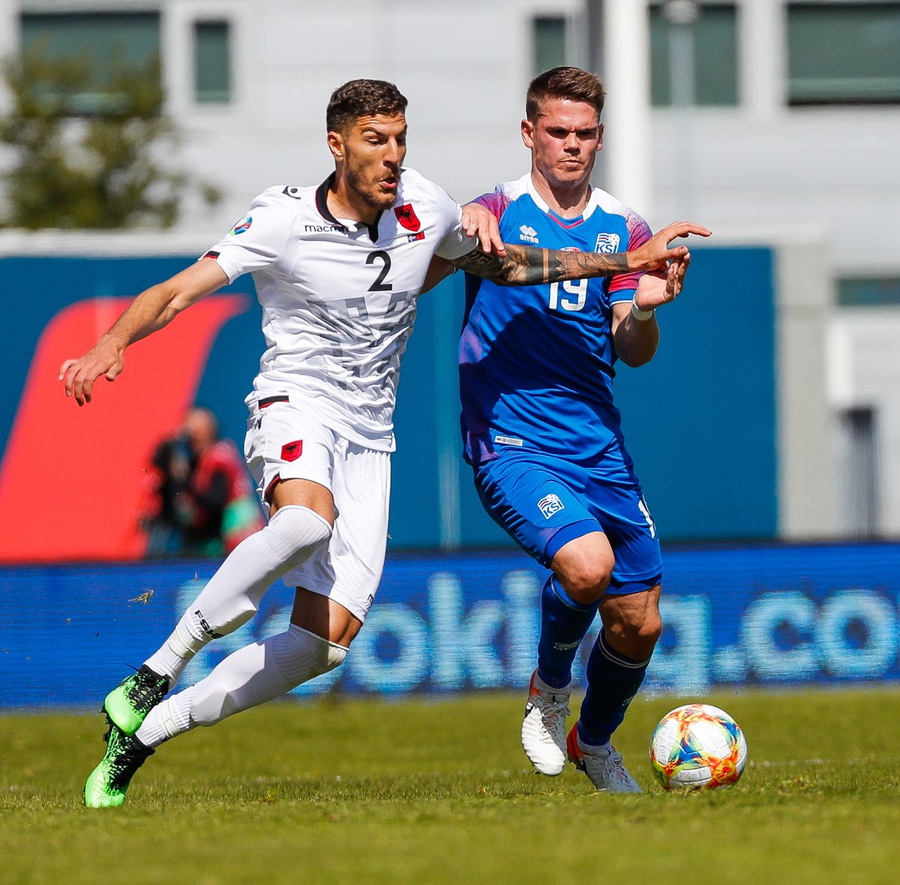 Ermir Lenjani með fasta fyrirgjöf en sem betur fer fyrir Ísland er Kári Árnason á hárréttum stað og kemur boltanum frá.