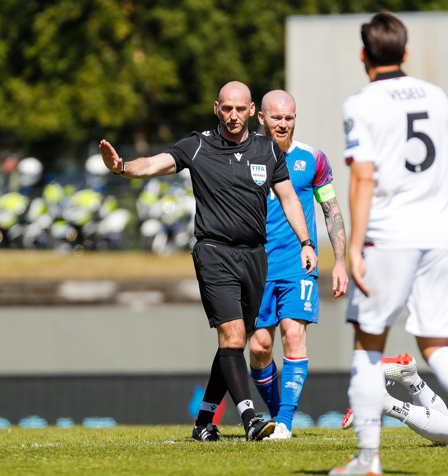 Hornið fer ekki yfir Ara Frey sem að er fyrsti maður og Ísland kemst í skyndisókn. Þar er brotið á Gylfa sem að liggur eftir. Menn vilja sjá spjald en Bobby er ekki sammála.