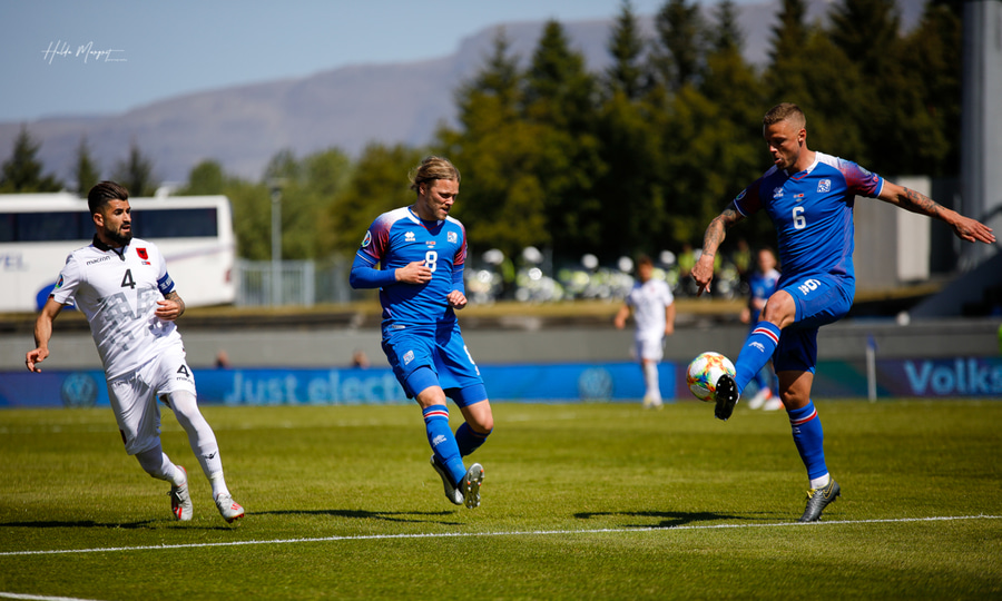 Albanir að dæla hér boltum í teiginn trekk í trekk en alltaf er einhver Íslendingur fyrstur í boltann. Góð vörn hjá strákunum.