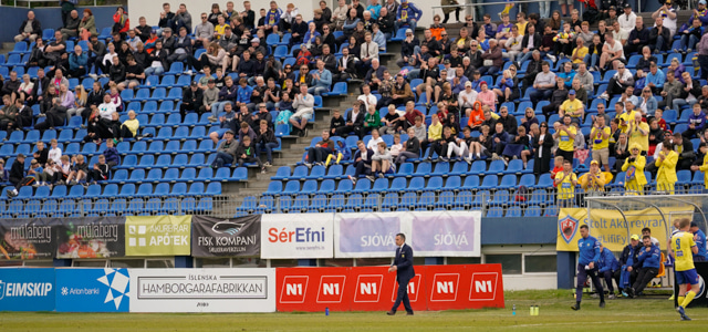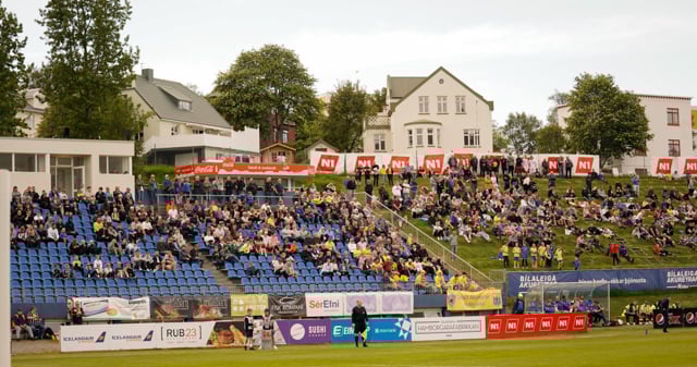 Leikurinn fer fram á Greifavellinum í blíðskapaveðri hér á Akureyri. Bærinn iðar af lífi enda Júbbilering og Bíladagar í fullum gangi.