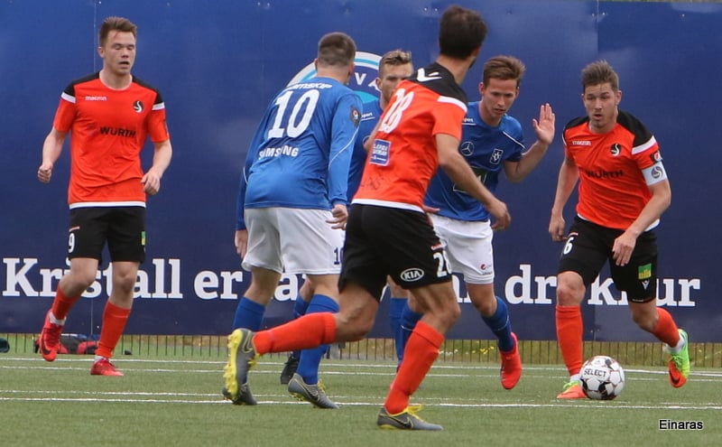 Hilmar með boltann fyrir utan teig hægra meginn brotið á honum en Helgi beitir hagnaði og boltinn berst á Ævar sem gerir vel í að klára framhjá Aroni í markinu.