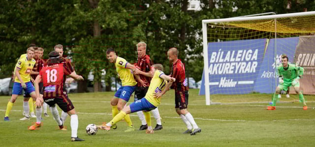 Mátti reyna! Hallgrímur setur boltann út við vítateig á bróður sinn úr hornspyrnunni sem tekur boltann á lofti en nær ekki að hitta boltann vel.