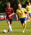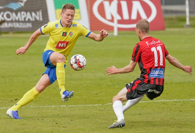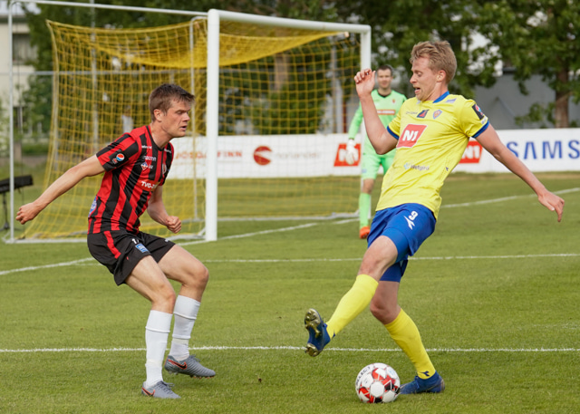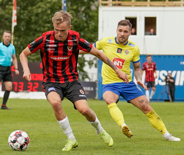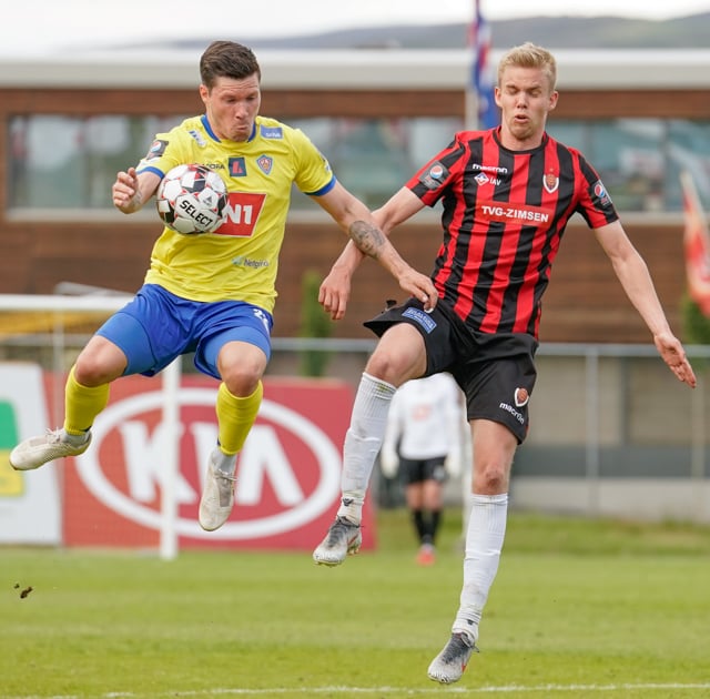 Geggjaður bolti frá Ásgeir inn fyrir vörn Víkinga en Dofri gerir vel í að hindra Elfar Árna í för sinni að boltanum.