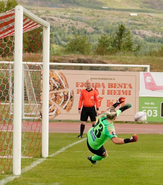Ásdís Karen með gott skot af 30 metra færi sem að Bryndís Lára ver vel í horn! Sjálfsagt að reyna þessar neglur.