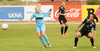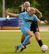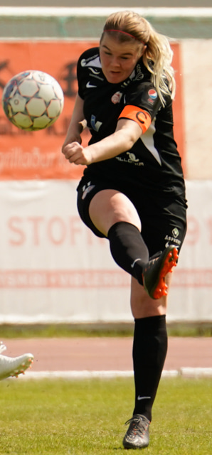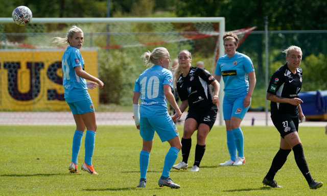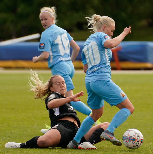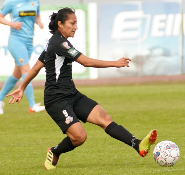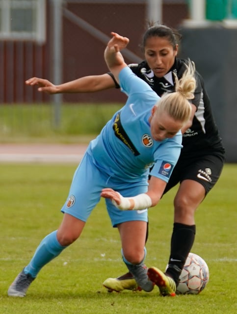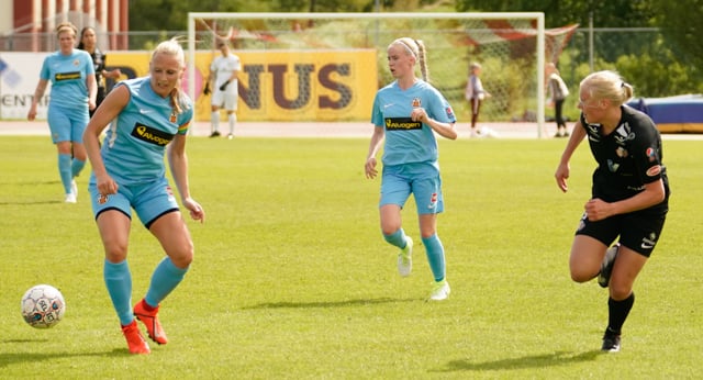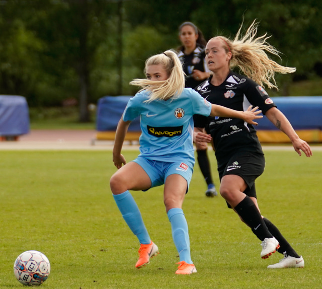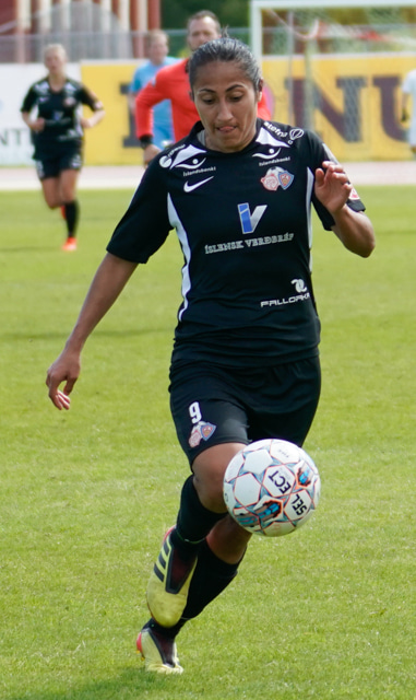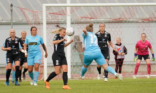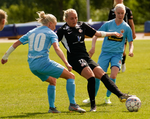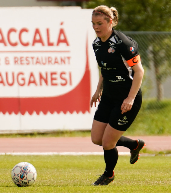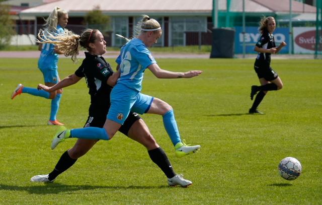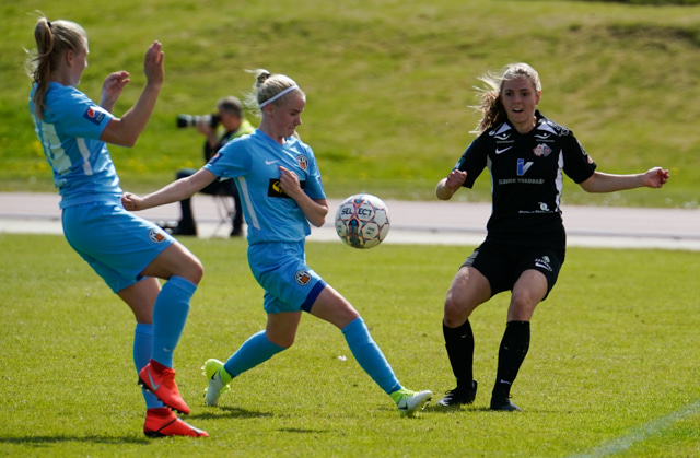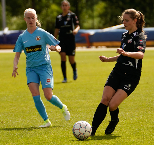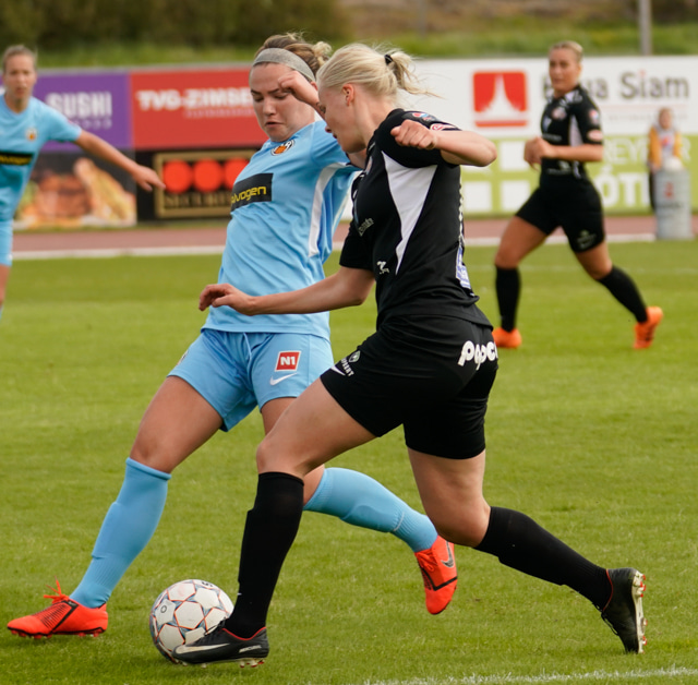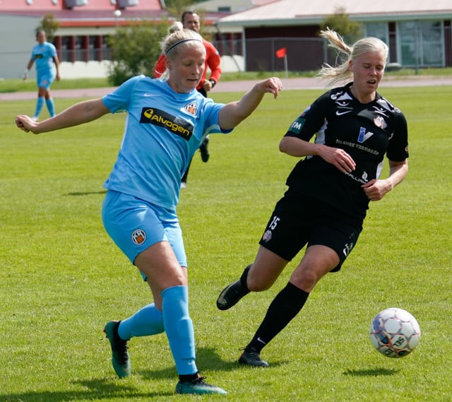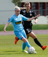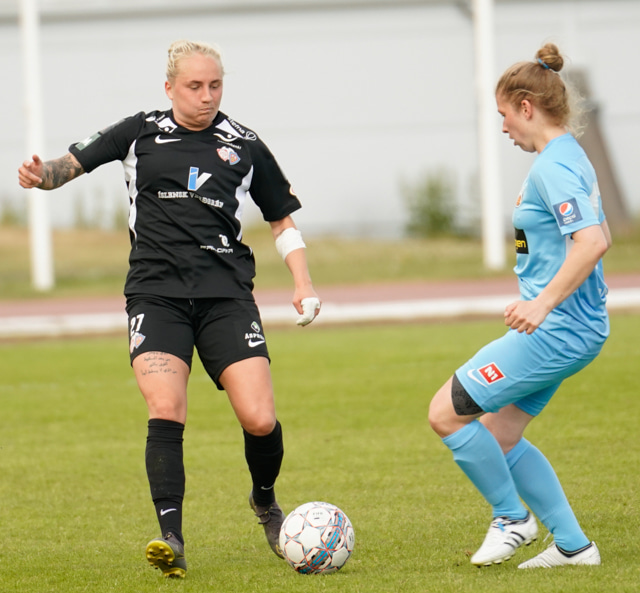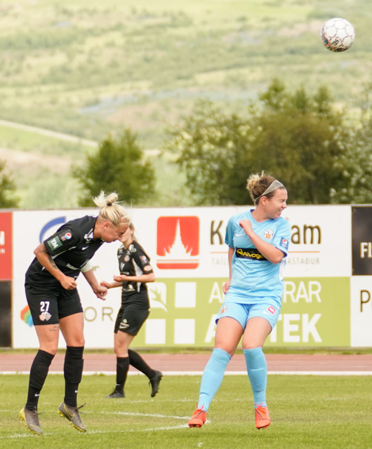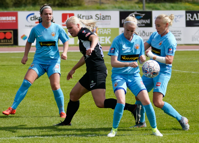 Katrín gerir vel í að snúa Biöncu af sér og leggur hann útá kant á Ásdísi, sem að gerir sig seka um klaufalega rangstöðu.