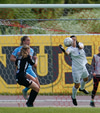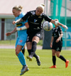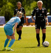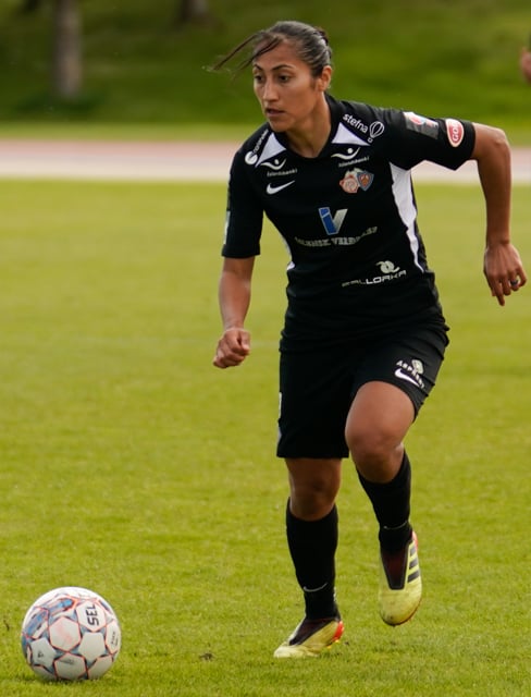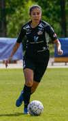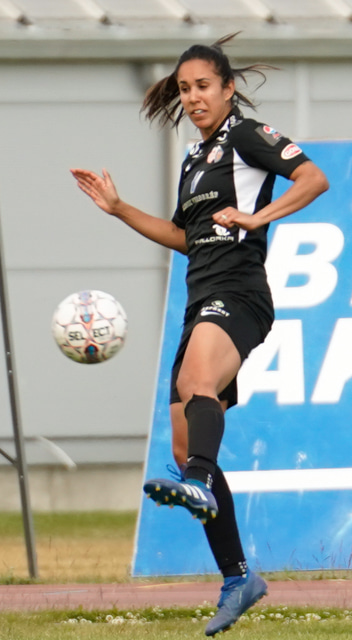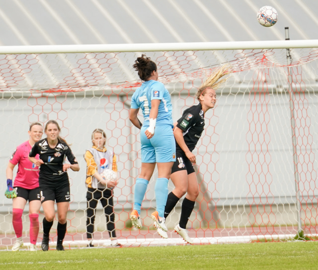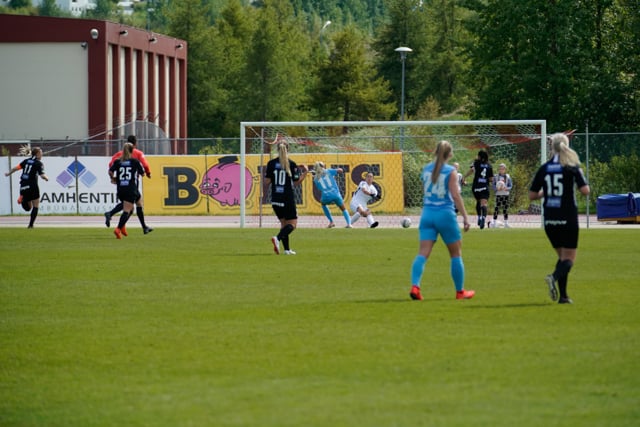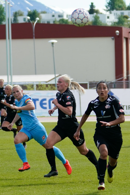 Guðmunda setur boltann inní teig á nautsterka Katrínu sem að heldur Biöncu frá sér, til þess að reyna að koma skoti á markið, en Bianca nær með allri sinni þrjósku að tækla boltann í horn.
