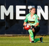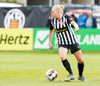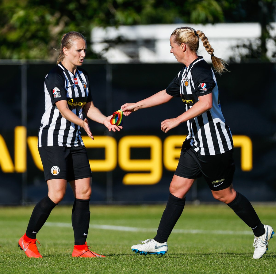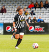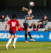 Lauren missir af fyrirgjöfinni í horninu en er heppin því liðsfélagar hennar ná að hreinsa.