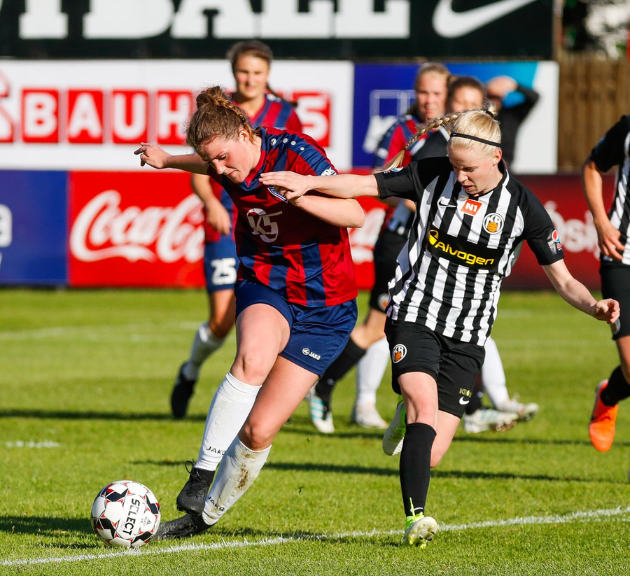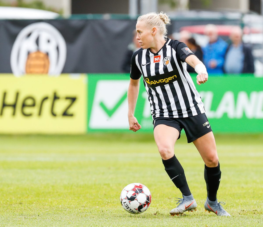 Þá er komið að Murielle. Hún gerir vel í að ná fyrirgjöf frá vinstri. Þar gerir Krista sig líklega til að skalla boltann en 100-leikja Hugrún Lilja er fyrri til og kemur boltanum af hættusvæðinu!