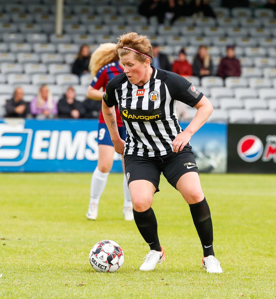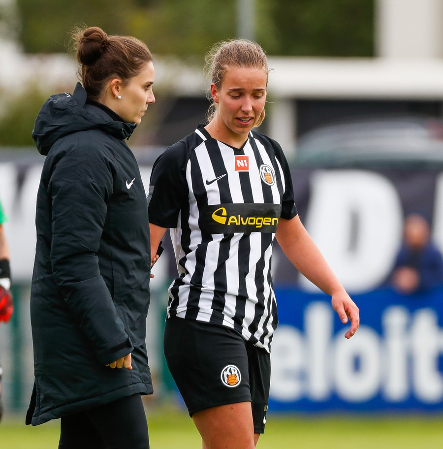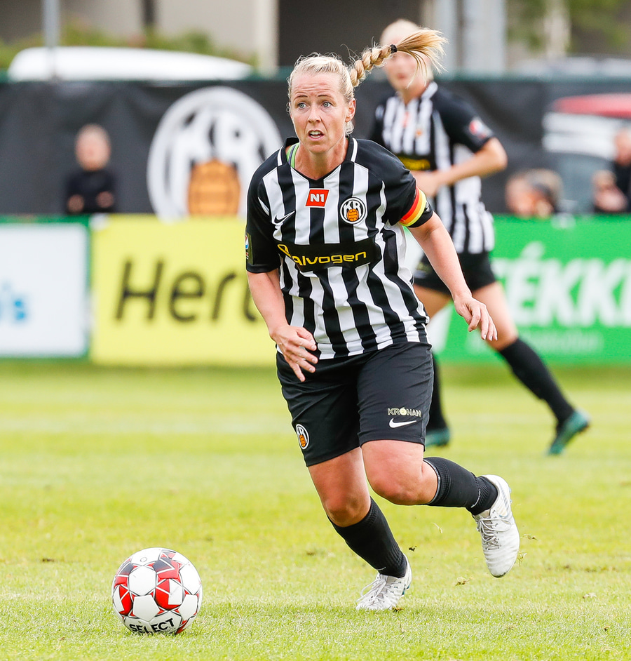 Last á liðsstjórn KR. Ingunn hafði komið aftur inn á völlinn eftir höfuðhöggið áðan. Nú lendir hún í baráttu við Murielle, lendir í jörðinni og er greinilega ekki í lagi og þarf skiptingu.