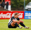 Jacqueline fellur við við vítateigslínuna hægra megin. Gestirnir í stúkunni hrópa eftir aukaspyrnu eða víti en Steinar dómari er ekki á sama máli.