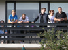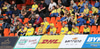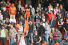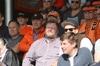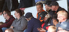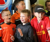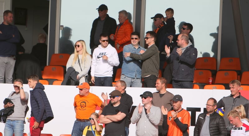 Áhorfendur streyma í stúkunni. Hörðustu stuðningsmenn KA hentu sér í hópferð og greinilegt að það hefur ekki vantað söngvatn í þann langferðabíl.