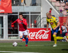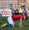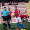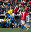 Kristinn Freyr tekur spyrnuna og hún er ömurleg, fer í miðjan vegginn. Boltinn dettur svo á Birki sem neglir að marki en boltinn framhjá markinu.
