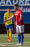 Kristinn Freyr fer í harkalega tæklingu á Elfari úti við endalínu á miðjum vellinum. Ívar virtist ekki ætla dæma fyrst en dæmir aukaspyrnuna.