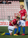 Nú er Hallgrímur að kveinka sér og virðist biðja um skiptingu, mjög vont fyrir KA að missa tvo hafsenta í byrjun leiks.