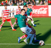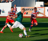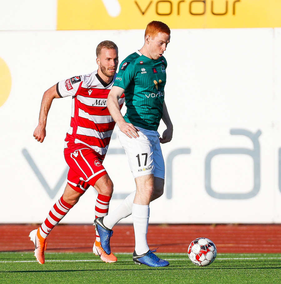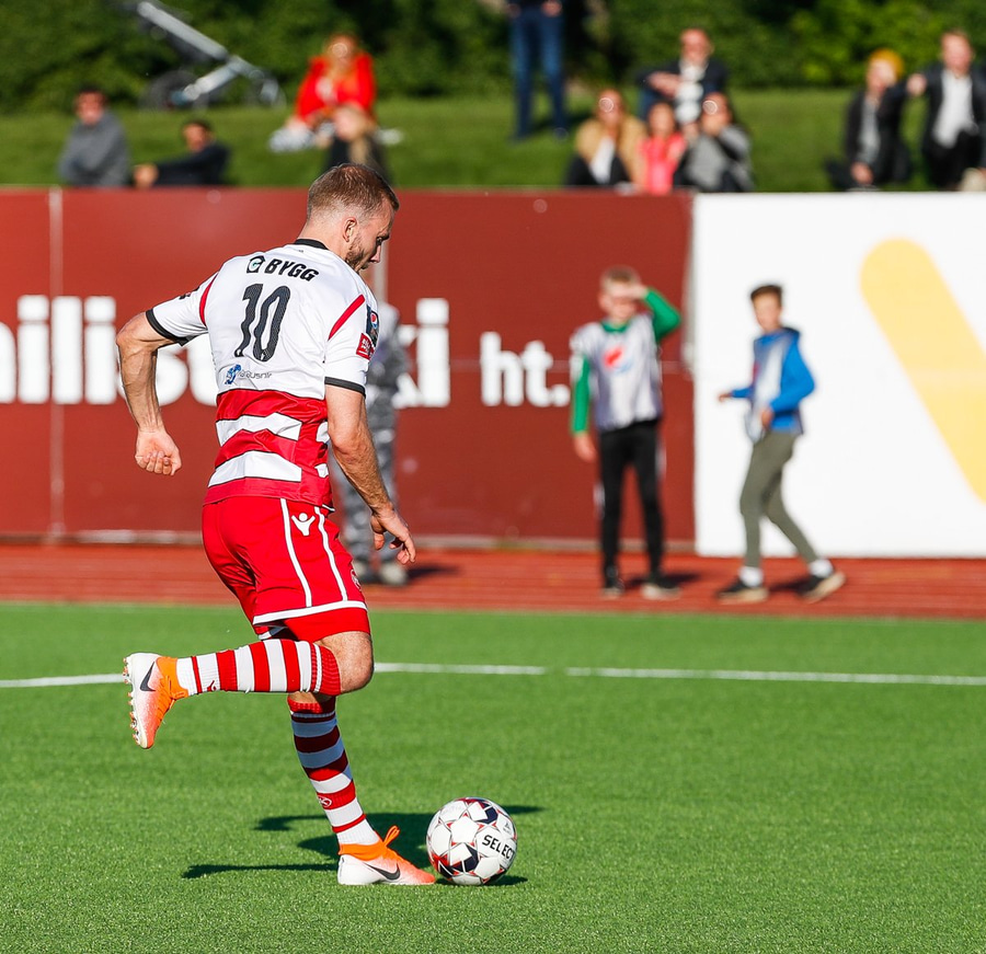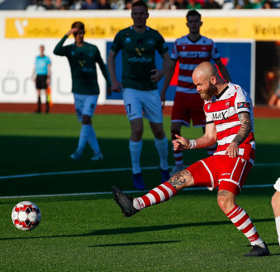 Thomas Mikkelsen fór illa með Björn Berg Bryde, náði að snúa á hann. BBB braut af sér rétt fyrir utan vítateiginn, til vinstri.