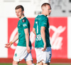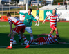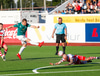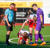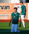 Arnar Freyr nær að verja á línunni en Ásgeir Börkur fer í hann og það þarf aðhlynningu. Arnar getur haldið leik áfram.