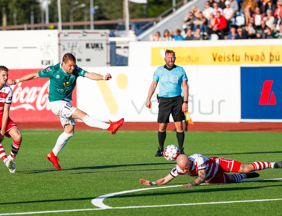 Viktor Örn Margeirsson með skot eftir hornspyrnu!