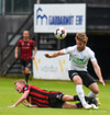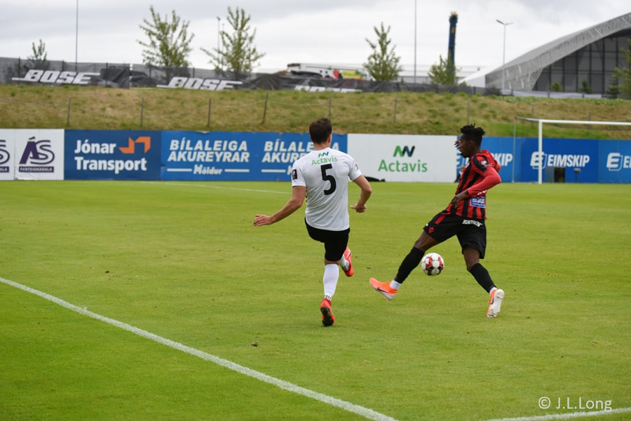 Vá Jónatan Ingi sendir Dofra Snorrason í Fossvoginn með gabbhreyfingu, en lendir á vegg þegar Kári Árnason kemur og hirðir af honum boltann.