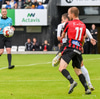 Fín fyrirgjöf frá Guðmundi Andra á Örvar en Örvar nær ekki að stýra skalla sínum að marki.