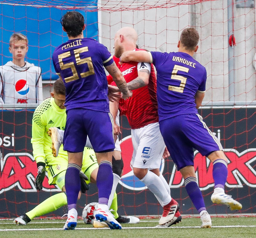 Finsen liggur í teignum eftir innkast frá hægri, var rétt við það að ná til boltans en Slóveninn virtist ná að koma honum úr jafnvægi.