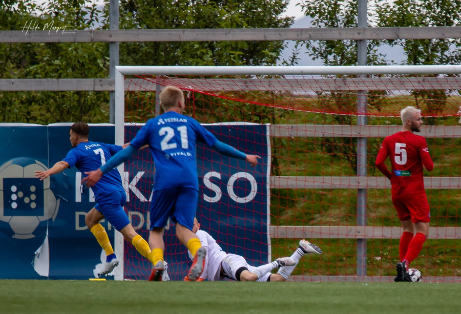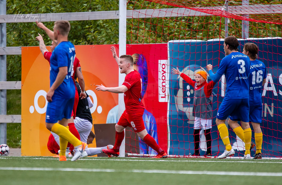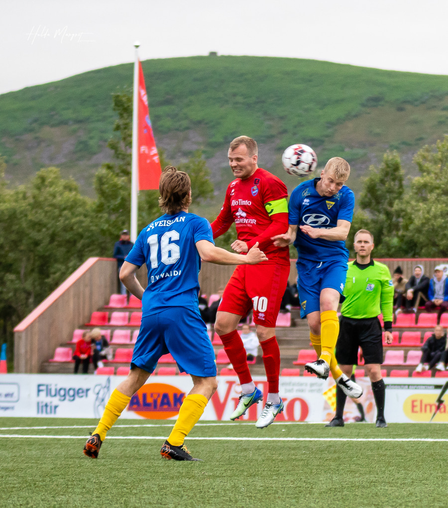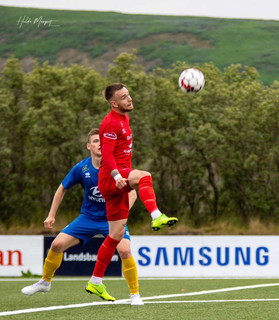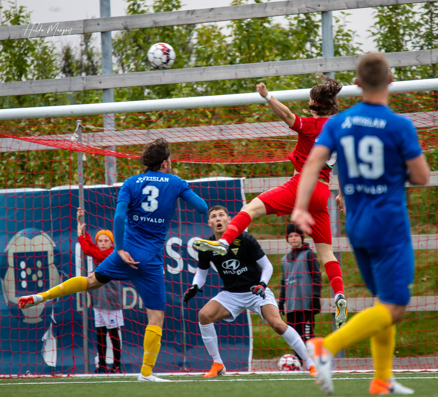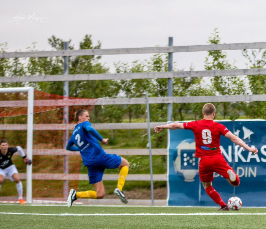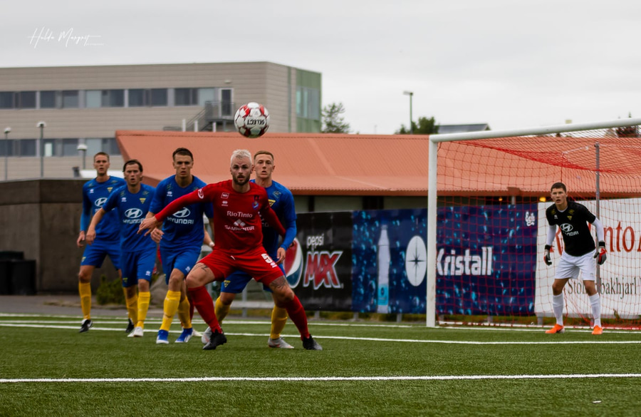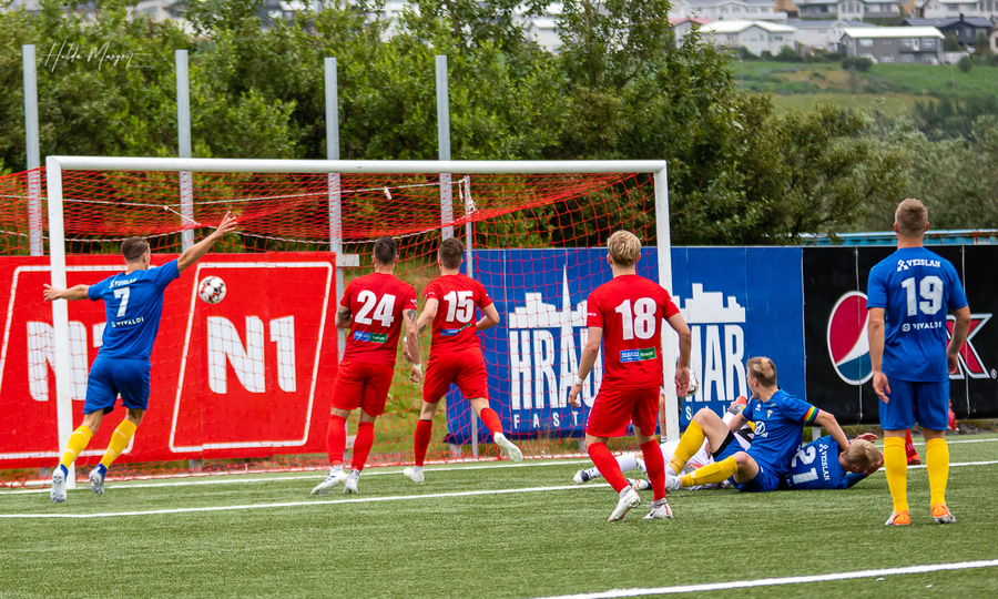 Halldór Kristján fyrirliði kemur sínum mönnum yfir með flottum skalla eftir aukaspyrnuna