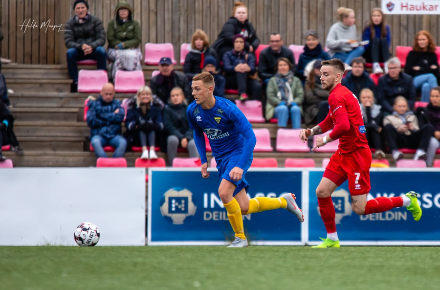 Axel Freyr brýtur Daníel Snorra og Haukar fá aukaspyrnu sem verður líklegast að sendingu inn í teig