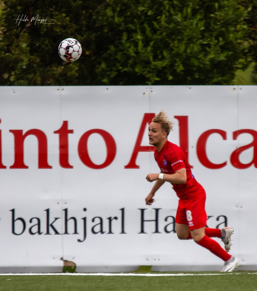 Birgir vinnur boltann og hleypur yfir allan völlinn en sendinginn inn í teiginn er slæm og endar hjá Hákoni
