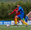 Arnar nær boltanum og hleypur af stað en Halldór stelur boltanum. Arnar hefði mátt senda þarna
