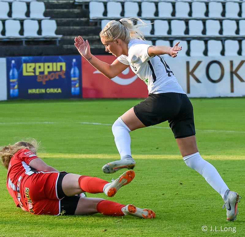ERla Karítas við það að sleppa ein í gegn er Maggý er eins og klettur í vörninni og stoppar hana
