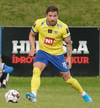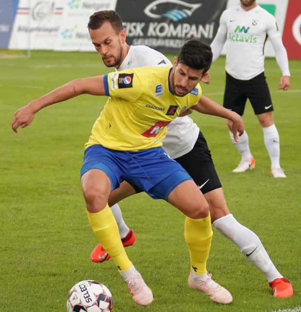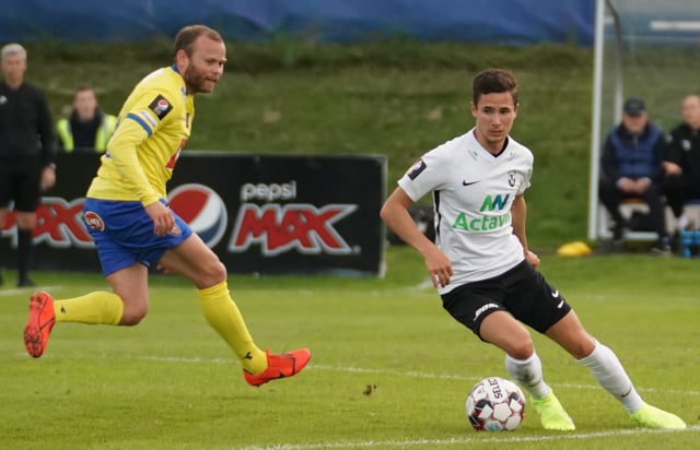 Morten Beck fær hér boltann inná teignum en skot hans fer í varnarmann og Aron skutlar sér á boltann.